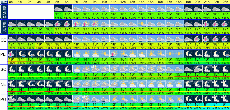 Ura | 02h | 03h | 04h | 05h | 06h | 07h | 08h | 09h | 10h | 11h | 12h | 13h | 14h | 15h | 16h | 17h | 18h | 19h | 20h | 21h | 22h | 23h | | | |  |  |  |  |  |  |  |  |  |  |  |  |  |  |  |  |  |  |  |  |  |  | Temperatura [C°] | 15°C | 15°C | 16°C | 16°C | 16°C | 16°C | 16°C | 16°C | 16°C | 16°C | 16°C | 16°C | 16°C | 16°C | 16°C | 16°C | 16°C | 16°C | 16°C | 16°C | 16°C | 16°C | Občutek [C°] | 13°C | 14°C | 14°C | 14°C | 14°C | 14°C | 14°C | 14°C | 14°C | 14°C | 13°C | 14°C | 14°C | 14°C | 13°C | 14°C | 14°C | 14°C | 14°C | 14°C | 14°C | 14°C | Možnost padavin | 49 % | 50 % | 58 % | 71 % | 57 % | 57 % | 57 % | 64 % | 79 % | 64 % | 65 % | 79 % | 72 % | 72 % | 79 % | 79 % | 66 % | 66 % | 60 % | 86 % | 73 % | 79 % | Količina padavin [mm] | 2 mm | 2 mm | 2 mm | 2 mm | 2 mm | 2 mm | 1 mm | 1 mm | 1 mm | 1 mm | 1 mm | 2 mm | 3 mm | 3 mm | 4 mm | 4 mm | 3 mm | 2 mm | 1 mm | | 1 mm | 1 mm | Sneg [cm] | | | | | | | | | | | | | | | | | | | | | | | UV index | | | | | | | | | | | | | | | | | | | | | | | Hitrost vetra | 15 km/h | 15 km/h | 15 km/h | 15 km/h | 15 km/h | 15 km/h | 15 km/h | 15 km/h | 16 km/h | 17 km/h | 17 km/h | 17 km/h | 17 km/h | 17 km/h | 17 km/h | 17 km/h | 16 km/h | 15 km/h | 15 km/h | 14 km/h | 14 km/h | 14 km/h | Smer vetra | J | J | J | J | J | J | V | V | V | J | V | V | V | V | J | V | V | V | J | J | J | J | Zračni tlak | 1010 | 1010 | 1010 | 1009 | 1009 | 1009 | 1009 | 1009 | 1009 | 1009 | 1009 | 1009 | 1008 | 1008 | 1008 | 1008 | 1008 | 1008 | 1009 | 1009 | 1009 | 1009 | Vlaga | 90 % | 89 % | 86 % | 83 % | 81 % | 80 % | 78 % | 75 % | 74 % | 76 % | 77 % | 79 % | 81 % | 79 % | 79 % | 79 % | 79 % | 82 % | 84 % | 85 % | 86 % | 87 % |