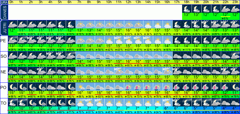 | Ura | 00h | 01h | 02h | 03h | 04h | 05h | 06h | 07h | 08h | 09h | 10h | 11h | 12h | 13h | 14h | 15h | 16h | 17h | 18h | 19h | 20h | 21h | 22h | 23h | |  |  |  |  |  |  |  |  |  |  |  |  |  |  |  |  |  |  |  |  |  |  |  |  | | Temperatura [C°] | 12°C | 11°C | 11°C | 11°C | 11°C | 11°C | 12°C | 13°C | 13°C | 14°C | 15°C | 15°C | 15°C | 16°C | 16°C | 15°C | 15°C | 15°C | 14°C | 14°C | 14°C | 13°C | 13°C | 13°C | | Občutek [C°] | 11°C | 10°C | 10°C | 10°C | 10°C | 10°C | 11°C | 12°C | 12°C | 13°C | 14°C | 14°C | 14°C | 14°C | 14°C | 14°C | 14°C | 13°C | 13°C | 13°C | 12°C | 12°C | 12°C | 12°C | | Možnost padavin | | 25 % | 25 % | 25 % | 6 % | 13 % | 20 % | 20 % | 26 % | 33 % | 33 % | 33 % | 33 % | 33 % | 33 % | 21 % | 25 % | 28 % | 28 % | 29 % | 22 % | 27 % | 27 % | 26 % | | Količina padavin [mm] | | | | | | | | | | | | | | | | | | | | | | | | | Sneg [cm] | | | | | | | | | | | | | | | | | | | | | | | | | | UV index | | | | | | | | | | | | UV 1 | UV 1 | UV 1 | | | | | | | | | | | | Hitrost vetra | 5 km/h | 5 km/h | 5 km/h | 5 km/h | 5 km/h | 5 km/h | 5 km/h | 5 km/h | 5 km/h | 5 km/h | 6 km/h | 6 km/h | 7 km/h | 7 km/h | 7 km/h | 7 km/h | 7 km/h | 7 km/h | 7 km/h | 7 km/h | 7 km/h | 6 km/h | 6 km/h | 6 km/h | Smer vetra | V | V | V | V | V | V | V | V | V | V | V | J | J | J | Z | Z | V | V | V | V | V | V | V | V | | Zračni tlak | 1024 | 1024 | 1024 | 1024 | 1024 | 1024 | 1024 | 1024 | 1025 | 1025 | 1025 | 1025 | 1024 | 1024 | 1024 | 1024 | 1024 | 1024 | 1024 | 1024 | 1024 | 1024 | 1024 | 1024 | | Vlaga | 86 % | 88 % | 91 % | 92 % | 93 % | 92 % | 90 % | 87 % | 82 % | 77 % | 74 % | 72 % | 71 % | 71 % | 70 % | 70 % | 70 % | 73 % | 76 % | 79 % | 80 % | 81 % | 82 % | 84 % |