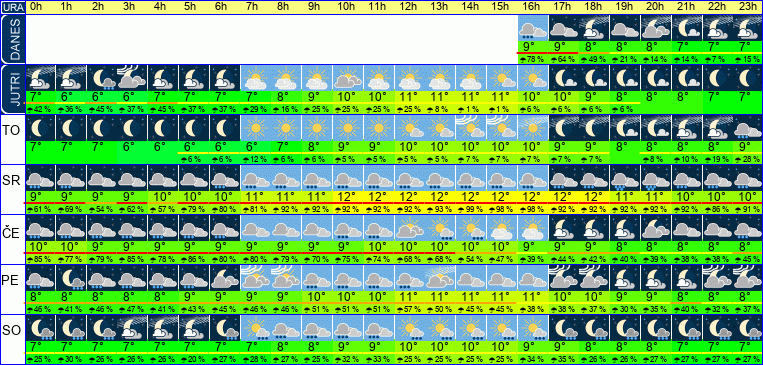 | Ura | 14h | 15h | 16h | 17h | 18h | 19h | 20h | 21h | 22h | 23h | | | | | | | | | | | | | | | |  |  |  |  |  |  |  |  |  |  | | Temperatura [C°] | 9°C | 9°C | 9°C | 9°C | 8°C | 8°C | 8°C | 7°C | 7°C | 7°C | | Občutek [C°] | 7°C | 6°C | 6°C | 6°C | 6°C | 6°C | 5°C | 5°C | 4°C | 4°C | | Možnost padavin | 92 % | 92 % | 78 % | 64 % | 49 % | 21 % | 14 % | 14 % | 8 % | 15 % | | Količina padavin [mm] | 3 mm | 3 mm | 2 mm | | | | | | | | Sneg [cm] | | | | | | | | | | | | UV index | | | | | | | | | | | | Hitrost vetra | 13 km/h | 13 km/h | 12 km/h | 11 km/h | 9 km/h | 7 km/h | 7 km/h | 7 km/h | 8 km/h | 7 km/h | Smer vetra | J | J | J | J | J | V | V | V | V | V | | Zračni tlak | 998 | 998 | 999 | 999 | 999 | 999 | 999 | 999 | 999 | 999 | | Vlaga | 100 % | 97 % | 93 % | 92 % | 90 % | 89 % | 89 % | 89 % | 90 % | 90 % |