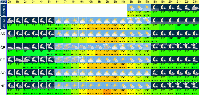 | Ura | 13h | 14h | 15h | 16h | 17h | 18h | 19h | 20h | 21h | 22h | 23h | | | | | | | | | | | | | | |  |  |  |  |  |  |  |  |  |  |  | | Temperatura [C°] | 15°C | 14°C | 14°C | 13°C | 12°C | 11°C | 11°C | 11°C | 11°C | 11°C | 11°C | | Občutek [C°] | 15°C | 13°C | 12°C | 12°C | 11°C | 10°C | 10°C | 10°C | 10°C | 10°C | 10°C | | Možnost padavin | 6 % | 25 % | 25 % | 8 % | 1 % | | | | | | | | Količina padavin [mm] | | | | | | | | | | | | Sneg [cm] | | | | | | | | | | | | | UV index | UV 3 | UV 2 | UV 2 | UV 1 | | | | | | | | | Hitrost vetra | 7 km/h | 7 km/h | 7 km/h | 6 km/h | 6 km/h | 5 km/h | 4 km/h | 4 km/h | 4 km/h | 4 km/h | 4 km/h | Smer vetra | J | J | J | J | V | V | V | V | V | V | V | | Zračni tlak | 1025 | 1025 | 1025 | 1025 | 1025 | 1025 | 1025 | 1025 | 1025 | 1026 | 1026 | | Vlaga | 75 % | 76 % | 80 % | 89 % | 93 % | 92 % | 92 % | 89 % | 88 % | 86 % | 83 % |
