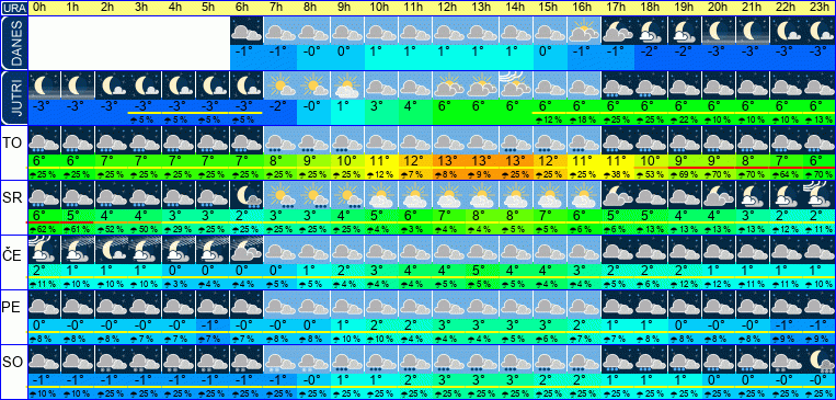 | Ura | 00h | 01h | 02h | 03h | 04h | 05h | 06h | 07h | 08h | 09h | 10h | 11h | 12h | 13h | 14h | 15h | 16h | 17h | 18h | 19h | 20h | 21h | 22h | 23h | |  |  |  |  |  |  |  |  |  |  |  |  |  |  |  |  |  |  |  |  |  |  |  |  | | Temperatura [C°] | -3°C | -3°C | -3°C | -3°C | -3°C | -3°C | -3°C | -2°C | -0°C | 1°C | 3°C | 4°C | 6°C | 6°C | 6°C | 6°C | 6°C | 6°C | 6°C | 6°C | 6°C | 6°C | 6°C | 6°C | | Občutek [C°] | -7°C | -8°C | -8°C | -8°C | -8°C | -8°C | -8°C | -7°C | -6°C | -4°C | -2°C | -1°C | 1°C | 1°C | 2°C | 2°C | 2°C | 1°C | 2°C | 2°C | 2°C | 2°C | 2°C | 2°C | | Možnost padavin | | | | 5 % | 5 % | 5 % | 5 % | | | | | | | | | 12 % | 18 % | 25 % | 25 % | 22 % | 10 % | 10 % | 10 % | 13 % | | Količina padavin [mm] | | | | | | | | | | | | | | | | | | | | | | | | | Sneg [cm] | | | | | | | | | | | | | | | | | | | | | | | | | | UV index | | | | | | | | | | | UV 1 | UV 1 | UV 1 | UV 1 | | | | | | | | | | | | Hitrost vetra | 10 km/h | 10 km/h | 11 km/h | 11 km/h | 12 km/h | 12 km/h | 13 km/h | 13 km/h | 14 km/h | 14 km/h | 14 km/h | 15 km/h | 15 km/h | 15 km/h | 14 km/h | 14 km/h | 14 km/h | 14 km/h | 14 km/h | 14 km/h | 14 km/h | 14 km/h | 14 km/h | 14 km/h | Smer vetra | J | J | J | J | J | J | J | J | J | J | J | J | J | J | J | J | J | J | J | J | J | J | J | J | | Zračni tlak | 1018 | 1018 | 1017 | 1017 | 1016 | 1016 | 1015 | 1015 | 1015 | 1014 | 1014 | 1013 | 1012 | 1011 | 1011 | 1010 | 1010 | 1010 | 1009 | 1008 | 1008 | 1007 | 1007 | 1006 | | Vlaga | 100 % | 99 % | 98 % | 97 % | 97 % | 97 % | 96 % | 92 % | 86 % | 79 % | 75 % | 73 % | 73 % | 75 % | 76 % | 80 % | 84 % | 87 % | 89 % | 90 % | 90 % | 92 % | 93 % | 95 % |