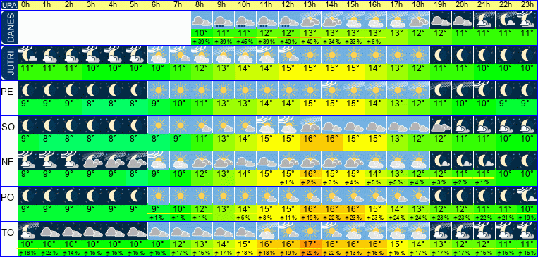 | Ura | 00h | 01h | 02h | 03h | 04h | 05h | 06h | 07h | 08h | 09h | 10h | 11h | 12h | 13h | 14h | 15h | 16h | 17h | 18h | 19h | 20h | 21h | 22h | 23h | |  |  |  |  |  |  |  |  |  |  |  |  |  |  |  |  |  |  |  |  |  |  |  |  | | Temperatura [C°] | 10°C | 10°C | 10°C | 10°C | 10°C | 10°C | 10°C | 12°C | 13°C | 14°C | 15°C | 16°C | 16°C | 17°C | 16°C | 16°C | 16°C | 15°C | 14°C | 13°C | 12°C | 12°C | 11°C | 11°C | | Občutek [C°] | 7°C | 7°C | 7°C | 7°C | 7°C | 7°C | 7°C | 8°C | 10°C | 11°C | 12°C | 12°C | 12°C | 13°C | 13°C | 12°C | 12°C | 12°C | 11°C | 11°C | 10°C | 9°C | 9°C | 8°C | | Možnost padavin | 18 % | 23 % | 14 % | 15 % | 15 % | 16 % | 16 % | 17 % | 16 % | 17 % | 18 % | 18 % | 19 % | 20 % | 22 % | 13 % | 15 % | 16 % | 17 % | 17 % | 17 % | 16 % | 16 % | 15 % | | Količina padavin [mm] | | | | | | | | | | | | | | | | | | | | | | | | | Sneg [cm] | | | | | | | | | | | | | | | | | | | | | | | | | | UV index | | | | | | | | | | UV 1 | UV 1 | UV 2 | UV 3 | UV 2 | UV 2 | UV 1 | UV 1 | | | | | | | | | Hitrost vetra | 8 km/h | 8 km/h | 8 km/h | 8 km/h | 8 km/h | 8 km/h | 8 km/h | 8 km/h | 10 km/h | 11 km/h | 12 km/h | 13 km/h | 14 km/h | 14 km/h | 14 km/h | 13 km/h | 13 km/h | 11 km/h | 8 km/h | 7 km/h | 6 km/h | 7 km/h | 8 km/h | 8 km/h | Smer vetra | S | V | V | S | S | V | S | S | S | Z | Z | Z | Z | Z | Z | Z | Z | Z | Z | Z | S | S | V | V | | Zračni tlak | 1015 | 1014 | 1014 | 1014 | 1014 | 1013 | 1013 | 1013 | 1013 | 1013 | 1013 | 1012 | 1012 | 1011 | 1011 | 1012 | 1012 | 1012 | 1012 | 1012 | 1013 | 1013 | 1013 | 1013 | | Vlaga | 54 % | 54 % | 54 % | 55 % | 56 % | 56 % | 55 % | 53 % | 51 % | 50 % | 49 % | 46 % | 44 % | 43 % | 44 % | 46 % | 50 % | 56 % | 64 % | 70 % | 69 % | 63 % | 60 % | 59 % |