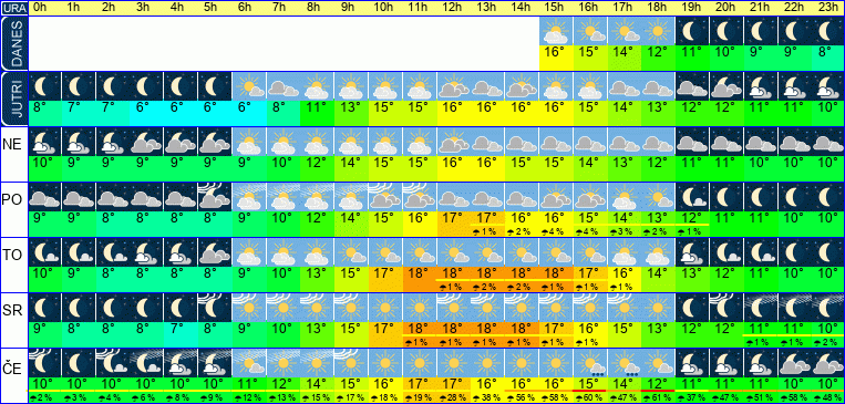 | Temperatura: | 10°C / 13°C / 17°C (+-4°C) | Možnost padavin: | 63 % | Hitrost vetra: | 4 / 18 / 28 km/h (+-30) | Skupna oblačnost: | 1 / 34 / 94 % (+-32) |