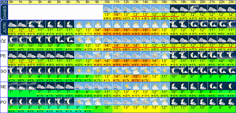 | Ura | 00h | 01h | 02h | 03h | 04h | 05h | 06h | 07h | 08h | 09h | 10h | 11h | 12h | 13h | 14h | 15h | 16h | 17h | 18h | 19h | 20h | 21h | 22h | 23h | |  |  |  |  |  |  |  |  |  |  |  |  |  |  |  |  |  |  |  |  |  |  |  |  | | Temperatura [C°] | 12°C | 12°C | 12°C | 11°C | 11°C | 11°C | 11°C | 11°C | 12°C | 14°C | 14°C | 15°C | 15°C | 15°C | 15°C | 14°C | 13°C | 12°C | 11°C | 11°C | 11°C | 10°C | 10°C | 10°C | | Občutek [C°] | 11°C | 11°C | 11°C | 10°C | 10°C | 10°C | 10°C | 11°C | 12°C | 13°C | 14°C | 14°C | 15°C | 15°C | 14°C | 13°C | 12°C | 11°C | 11°C | 10°C | 10°C | 9°C | 9°C | 8°C | | Možnost padavin | 54 % | 47 % | 47 % | 52 % | 26 % | 31 % | 29 % | 22 % | 28 % | 34 % | 22 % | 15 % | 9 % | 8 % | 8 % | 7 % | 6 % | 12 % | 12 % | 4 % | 3 % | 2 % | 1 % | 1 % | | Količina padavin [mm] | | | | 3 mm | | | | | | | | | | | | | | | | | | | | | Sneg [cm] | | | | | | | | | | | | | | | | | | | | | | | | | | UV index | | | | | | | | | | | | UV 1 | UV 1 | UV 1 | UV 1 | | | | | | | | | | | Hitrost vetra | 2 km/h | 2 km/h | 2 km/h | 1 km/h | 1 km/h | 1 km/h | 1 km/h | 1 km/h | 1 km/h | 1 km/h | 1 km/h | 1 km/h | 1 km/h | 1 km/h | 1 km/h | 1 km/h | 1 km/h | 1 km/h | 1 km/h | 1 km/h | 1 km/h | 1 km/h | 1 km/h | 1 km/h | Smer vetra | V | V | V | V | V | V | V | V | V | V | V | V | V | S | S | S | S | S | S | S | S | S | S | S | | Zračni tlak | 1004 | 1004 | 1003 | 1003 | 1002 | 1003 | 1003 | 1003 | 1004 | 1005 | 1006 | 1006 | 1006 | 1006 | 1006 | 1007 | 1007 | 1008 | 1008 | 1009 | 1009 | 1009 | 1010 | 1010 | | Vlaga | 76 % | 77 % | 76 % | 76 % | 76 % | 78 % | 80 % | 78 % | 74 % | 70 % | 66 % | 64 % | 62 % | 63 % | 66 % | 73 % | 80 % | 85 % | 87 % | 87 % | 85 % | 82 % | 80 % | 81 % |
