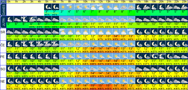 | Ura | 00h | 01h | 02h | 03h | 04h | 05h | 06h | 07h | 08h | 09h | 10h | 11h | 12h | 13h | 14h | 15h | 16h | 17h | 18h | 19h | 20h | 21h | 22h | 23h | |  |  |  |  |  |  |  |  |  |  |  |  |  |  |  |  |  |  |  |  |  |  |  |  | | Temperatura [C°] | 10°C | 10°C | 10°C | 9°C | 9°C | 9°C | 9°C | 10°C | 10°C | 11°C | 12°C | 13°C | 13°C | 13°C | 14°C | 13°C | 13°C | 12°C | 12°C | 11°C | 11°C | 11°C | 11°C | 11°C | | Občutek [C°] | 7°C | 7°C | 7°C | 7°C | 7°C | 7°C | 7°C | 7°C | 8°C | 9°C | 10°C | 10°C | 11°C | 11°C | 11°C | 11°C | 11°C | 10°C | 10°C | 10°C | 9°C | 9°C | 9°C | 9°C | | Možnost padavin | 4 % | 5 % | 25 % | 25 % | 25 % | 25 % | 25 % | 5 % | 12 % | 4 % | 4 % | 5 % | 7 % | 16 % | 9 % | 8 % | 8 % | 25 % | 25 % | 25 % | 25 % | 25 % | 8 % | 9 % | | Količina padavin [mm] | | | | | | | | | | | | | | | | | | | | | | | | | Sneg [cm] | | | | | | | | | | | | | | | | | | | | | | | | | | UV index | | | | | | | | | | | | UV 1 | UV 1 | UV 1 | UV 1 | UV 1 | | | | | | | | | | Hitrost vetra | 6 km/h | 6 km/h | 6 km/h | 6 km/h | 6 km/h | 7 km/h | 7 km/h | 7 km/h | 7 km/h | 8 km/h | 8 km/h | 8 km/h | 9 km/h | 10 km/h | 10 km/h | 10 km/h | 9 km/h | 8 km/h | 8 km/h | 8 km/h | 8 km/h | 9 km/h | 8 km/h | 8 km/h | Smer vetra | V | V | V | V | V | V | V | V | V | V | V | J | J | J | J | J | J | J | J | J | J | J | J | J | | Zračni tlak | 1024 | 1024 | 1024 | 1024 | 1024 | 1024 | 1024 | 1024 | 1024 | 1024 | 1024 | 1024 | 1024 | 1023 | 1023 | 1023 | 1023 | 1023 | 1023 | 1023 | 1023 | 1023 | 1023 | 1023 | | Vlaga | 77 % | 77 % | 77 % | 79 % | 79 % | 79 % | 79 % | 77 % | 74 % | 71 % | 70 % | 70 % | 71 % | 72 % | 73 % | 76 % | 79 % | 82 % | 83 % | 85 % | 85 % | 86 % | 87 % | 88 % |