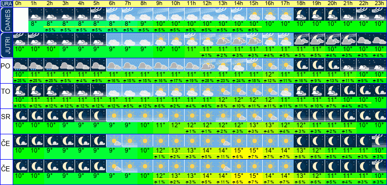 | Ura | 00h | 01h | 02h | 03h | 04h | 05h | 06h | 07h | 08h | 09h | 10h | 11h | 12h | 13h | 14h | 15h | 16h | 17h | 18h | 19h | 20h | 21h | 22h | 23h | |  |  |  |  |  |  |  |  |  |  |  |  |  |  |  |  |  |  |  |  |  |  |  |  | | Temperatura [C°] | 10°C | 11°C | 11°C | 11°C | 11°C | 11°C | 11°C | 11°C | 11°C | 11°C | 11°C | 11°C | 11°C | 11°C | 11°C | 11°C | 12°C | 11°C | 11°C | 11°C | 11°C | 11°C | 10°C | 10°C | | Občutek [C°] | 9°C | 9°C | 9°C | 9°C | 9°C | 9°C | 9°C | 9°C | 9°C | 9°C | 9°C | 9°C | 9°C | 9°C | 9°C | 9°C | 9°C | 9°C | 10°C | 9°C | 9°C | 9°C | 9°C | 8°C | | Možnost padavin | 25 % | 25 % | 25 % | 5 % | 4 % | 9 % | 16 % | 15 % | 15 % | 16 % | 17 % | 19 % | 28 % | 23 % | 24 % | 18 % | 12 % | 11 % | 16 % | 9 % | 13 % | 11 % | 9 % | 8 % | | Količina padavin [mm] | | | | | | | | | | | | | | | | | | | | | | | | | Sneg [cm] | | | | | | | | | | | | | | | | | | | | | | | | | | UV index | | | | | | | | | | | | UV 1 | UV 1 | UV 1 | UV 1 | UV 1 | UV 1 | | | | | | | | | Hitrost vetra | 6 km/h | 6 km/h | 6 km/h | 7 km/h | 9 km/h | 7 km/h | 6 km/h | 6 km/h | 6 km/h | 6 km/h | 7 km/h | 8 km/h | 9 km/h | 10 km/h | 10 km/h | 10 km/h | 9 km/h | 9 km/h | 7 km/h | 6 km/h | 7 km/h | 6 km/h | 7 km/h | 8 km/h | Smer vetra | V | V | V | V | V | V | J | J | J | J | Z | Z | Z | Z | Z | Z | Z | J | J | Z | V | V | V | V | | Zračni tlak | 1026 | 1026 | 1025 | 1025 | 1025 | 1025 | 1025 | 1025 | 1025 | 1025 | 1025 | 1025 | 1025 | 1025 | 1024 | 1024 | 1024 | 1024 | 1025 | 1025 | 1025 | 1026 | 1026 | 1026 | | Vlaga | 85 % | 84 % | 83 % | 83 % | 83 % | 84 % | 84 % | 84 % | 84 % | 83 % | 83 % | 82 % | 82 % | 83 % | 83 % | 83 % | 83 % | 84 % | 85 % | 85 % | 86 % | 87 % | 88 % | 89 % |