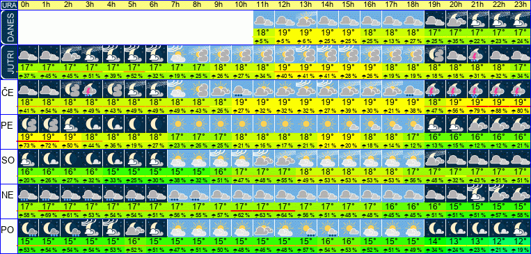 Ura | 00h | 01h | 02h | 03h | 04h | 05h | 06h | 07h | 08h | 09h | 10h | 11h | 12h | 13h | 14h | 15h | 16h | 17h | 18h | 19h | 20h | 21h | 22h | 23h | |  |  |  |  |  |  |  |  |  |  |  |  |  |  |  |  |  |  |  |  |  |  |  |  | Temperatura [C°] | 19°C | 19°C | 19°C | 18°C | 18°C | 18°C | 18°C | 17°C | 17°C | 17°C | 18°C | 18°C | 18°C | 18°C | 19°C | 19°C | 18°C | 18°C | 17°C | 16°C | 16°C | 16°C | 16°C | 16°C | Občutek [C°] | 16°C | 15°C | 13°C | 13°C | 13°C | 14°C | 15°C | 15°C | 15°C | 15°C | 15°C | 15°C | 15°C | 15°C | 16°C | 16°C | 16°C | 16°C | 16°C | 15°C | 15°C | 14°C | 14°C | 13°C | Možnost padavin | 83 % | 62 % | 41 % | 41 % | 40 % | 19 % | 16 % | 19 % | 23 % | 23 % | 23 % | 23 % | 23 % | 24 % | 17 % | 10 % | 8 % | 6 % | 7 % | 8 % | 9 % | 18 % | 19 % | 18 % | Količina padavin [mm] | 1 mm | | | | | | | | | | | | | | | | | | | | | | | | Sneg [cm] | | | | | | | | | | | | | | | | | | | | | | | | | UV index | | | | | | | | | | | | UV 1 | UV 1 | UV 1 | UV 1 | UV 1 | UV 1 | | | | | | | | Hitrost vetra | 21 km/h | 24 km/h | 27 km/h | 26 km/h | 24 km/h | 19 km/h | 15 km/h | 11 km/h | 9 km/h | 10 km/h | 12 km/h | 13 km/h | 13 km/h | 14 km/h | 13 km/h | 12 km/h | 11 km/h | 9 km/h | 7 km/h | 8 km/h | 9 km/h | 11 km/h | 13 km/h | 14 km/h | Smer vetra | J | Z | Z | Z | Z | Z | Z | Z | Z | Z | Z | Z | Z | Z | Z | Z | Z | Z | Z | J | J | J | J | J | Zračni tlak | 1001 | 1001 | 1001 | 1002 | 1003 | 1003 | 1004 | 1005 | 1006 | 1007 | 1008 | 1009 | 1009 | 1009 | 1009 | 1009 | 1009 | 1009 | 1010 | 1010 | 1010 | 1011 | 1011 | 1011 | Vlaga | 77 % | 61 % | 54 % | 55 % | 58 % | 61 % | 60 % | 59 % | 58 % | 56 % | 55 % | 55 % | 54 % | 54 % | 54 % | 56 % | 60 % | 64 % | 68 % | 73 % | 76 % | 77 % | 77 % | 78 % |