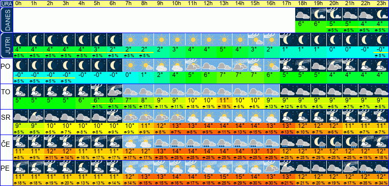 | Ura | 06h | 07h | 08h | 09h | 10h | 11h | 12h | 13h | 14h | 15h | 16h | 17h | 18h | 19h | 20h | 21h | 22h | 23h | | | | | | | |  |  |  |  |  |  |  |  |  |  |  |  |  |  |  |  |  |  | | Temperatura [C°] | 4°C | 5°C | 5°C | 6°C | 7°C | 8°C | 9°C | 10°C | 11°C | 11°C | 11°C | 11°C | 11°C | 11°C | 10°C | 10°C | 10°C | 9°C | | Občutek [C°] | -1°C | -1°C | -0°C | 0°C | 1°C | 2°C | 4°C | 5°C | 6°C | 6°C | 6°C | 7°C | 7°C | 8°C | 7°C | 6°C | 6°C | 6°C | | Možnost padavin | 7 % | 7 % | 13 % | 25 % | 35 % | 28 % | 29 % | 51 % | 65 % | 73 % | 73 % | 85 % | 85 % | 79 % | 72 % | 72 % | 72 % | 58 % | | Količina padavin [mm] | | | | | | | | | | | | 1 mm | 2 mm | 1 mm | 1 mm | 1 mm | | | Sneg [cm] | | | | | | | | | | | | | | | | | | | | UV index | | | | | | | | | | | | | | | | | | | | Hitrost vetra | 14 km/h | 15 km/h | 17 km/h | 19 km/h | 21 km/h | 22 km/h | 23 km/h | 23 km/h | 22 km/h | 21 km/h | 20 km/h | 18 km/h | 15 km/h | 13 km/h | 14 km/h | 15 km/h | 14 km/h | 12 km/h | Smer vetra | V | V | V | V | V | V | V | V | V | V | V | J | J | J | J | Z | Z | Z | | Zračni tlak | 1011 | 1010 | 1010 | 1009 | 1009 | 1008 | 1007 | 1006 | 1005 | 1004 | 1003 | 1003 | 1003 | 1002 | 1002 | 1002 | 1002 | 1002 | | Vlaga | 67 % | 68 % | 68 % | 67 % | 66 % | 69 % | 72 % | 72 % | 72 % | 74 % | 76 % | 80 % | 82 % | 84 % | 89 % | 77 % | 80 % | 84 % |