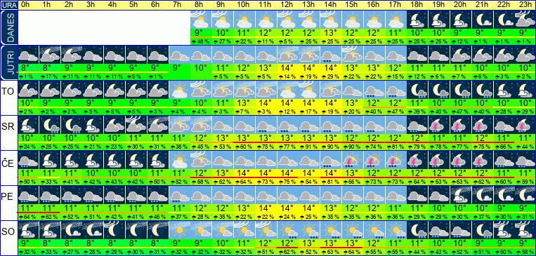 | Ura | 06h | 07h | 08h | 09h | 10h | 11h | 12h | 13h | 14h | 15h | 16h | 17h | 18h | 19h | 20h | 21h | 22h | 23h | | | | | | | |  |  |  |  |  |  |  |  |  |  |  |  |  |  |  |  |  |  | | Temperatura [C°] | 8°C | 9°C | 10°C | 11°C | 12°C | 12°C | 13°C | 13°C | 13°C | 13°C | 12°C | 11°C | 10°C | 10°C | 9°C | 9°C | 9°C | 9°C | | Občutek [C°] | 7°C | 8°C | 9°C | 10°C | 11°C | 12°C | 12°C | 12°C | 12°C | 11°C | 11°C | 10°C | 9°C | 9°C | 8°C | 8°C | 7°C | 7°C | | Možnost padavin | 35 % | 26 % | 12 % | 12 % | 6 % | 6 % | | 14 % | 7 % | 21 % | 7 % | 15 % | 8 % | 8 % | 2 % | 1 % | 7 % | 6 % | | Količina padavin [mm] | | | | | | | | | | | | | | | | | | | Sneg [cm] | | | | | | | | | | | | | | | | | | | | UV index | | | | | | UV 1 | UV 1 | UV 2 | UV 1 | UV 1 | | | | | | | | | | Hitrost vetra | 4 km/h | 4 km/h | 3 km/h | 2 km/h | 2 km/h | 2 km/h | 3 km/h | 4 km/h | 4 km/h | 5 km/h | 5 km/h | 4 km/h | 3 km/h | 3 km/h | 3 km/h | 3 km/h | 4 km/h | 4 km/h | Smer vetra | S | V | V | V | V | J | Z | Z | Z | Z | Z | J | V | V | V | V | V | V | | Zračni tlak | 1007 | 1007 | 1007 | 1008 | 1008 | 1008 | 1008 | 1008 | 1008 | 1008 | 1007 | 1007 | 1008 | 1008 | 1008 | 1008 | 1008 | 1008 | | Vlaga | 97 % | 94 % | 89 % | 86 % | 81 % | 77 % | 72 % | 73 % | 75 % | 78 % | 80 % | 87 % | 92 % | 93 % | 92 % | 92 % | 92 % | 91 % |