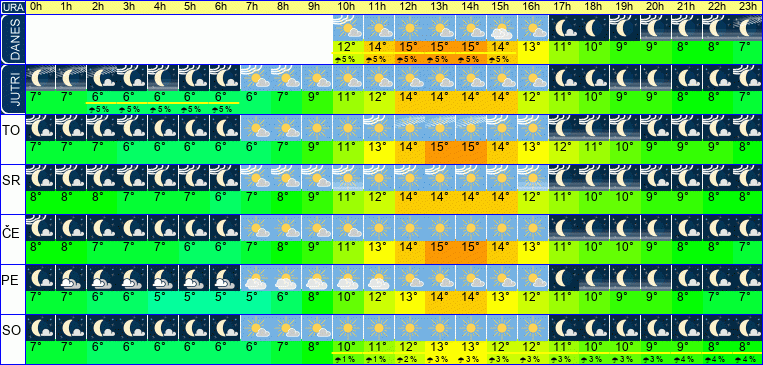 | Temperatura: | 12°C / 14°C / 17°C (+-1°C) | Možnost padavin: | 52 % | Hitrost vetra: | 5 / 7 / 9 km/h (+-8) | Skupna oblačnost: | 49 / 72 / 88 % (+-36) |