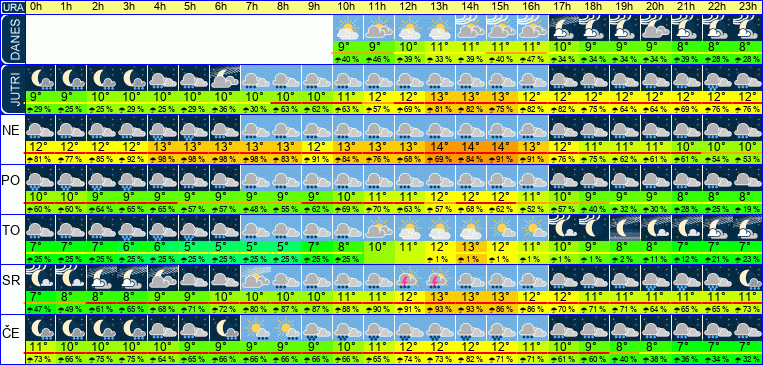 | Ura | 00h | 01h | 02h | 03h | 04h | 05h | 06h | 07h | 08h | 09h | 10h | 11h | 12h | 13h | 14h | 15h | 16h | 17h | 18h | 19h | 20h | 21h | 22h | 23h | |  |  |  |  |  |  |  |  |  |  |  |  |  |  |  |  |  |  |  |  |  |  |  |  | | Temperatura [C°] | 10°C | 10°C | 9°C | 9°C | 9°C | 9°C | 9°C | 9°C | 9°C | 10°C | 10°C | 11°C | 11°C | 12°C | 12°C | 12°C | 11°C | 10°C | 9°C | 9°C | 9°C | 8°C | 8°C | 7°C | | Občutek [C°] | 7°C | 7°C | 7°C | 7°C | 7°C | 7°C | 7°C | 7°C | 7°C | 7°C | 8°C | 8°C | 9°C | 9°C | 9°C | 9°C | 9°C | 8°C | 7°C | 7°C | 6°C | 6°C | 5°C | 5°C | | Možnost padavin | 60 % | 60 % | 64 % | 65 % | 66 % | 57 % | 57 % | 48 % | 55 % | 62 % | 69 % | 70 % | 63 % | 57 % | 68 % | 62 % | 52 % | 57 % | 40 % | 32 % | 30 % | 28 % | 25 % | 19 % | | Količina padavin [mm] | 4 mm | 5 mm | 4 mm | 3 mm | 2 mm | 2 mm | 2 mm | 2 mm | 2 mm | 1 mm | | | | | | | | 1 mm | 1 mm | 1 mm | 1 mm | | | | Sneg [cm] | | | | | | | | | | | | | | | | | | | | | | | | | | UV index | | | | | | | | | | | | | | | | | | | | | | | | | | Hitrost vetra | 13 km/h | 13 km/h | 12 km/h | 11 km/h | 10 km/h | 9 km/h | 9 km/h | 9 km/h | 8 km/h | 8 km/h | 8 km/h | 9 km/h | 10 km/h | 10 km/h | 10 km/h | 9 km/h | 8 km/h | 8 km/h | 8 km/h | 8 km/h | 8 km/h | 8 km/h | 8 km/h | 8 km/h | Smer vetra | V | V | V | V | V | V | V | V | V | V | V | V | V | V | V | V | V | V | V | S | S | S | S | S | | Zračni tlak | 999 | 999 | 999 | 999 | 999 | 999 | 999 | 999 | 999 | 999 | 999 | 999 | 998 | 998 | 998 | 997 | 997 | 997 | 998 | 998 | 998 | 998 | 998 | 999 | | Vlaga | 85 % | 86 % | 88 % | 88 % | 88 % | 88 % | 89 % | 90 % | 91 % | 89 % | 86 % | 82 % | 78 % | 74 % | 73 % | 74 % | 79 % | 83 % | 88 % | 89 % | 89 % | 89 % | 89 % | 90 % |