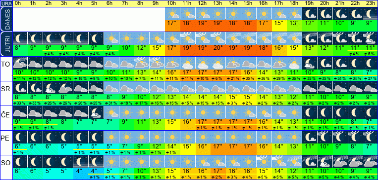 | Temperatura: | 9°C / 12°C / 17°C (+-4°C) | Možnost padavin: | 60 % | Hitrost vetra: | 4 / 6 / 9 km/h (+-19) | Skupna oblačnost: | 10 / 46 / 100 % (+-43) |
