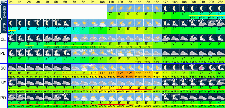 | Temperatura: | 3°C / 7°C / 10°C (+-2°C) | Možnost padavin: | 69 % | Hitrost vetra: | 3 / 5 / 9 km/h (+-10) | Skupna oblačnost: | 22 / 65 / 100 % (+-30) |