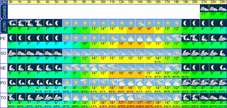| Ura | 00h | 01h | 02h | 03h | 04h | 05h | 06h | 07h | 08h | 09h | 10h | 11h | 12h | 13h | 14h | 15h | 16h | 17h | 18h | 19h | 20h | 21h | 22h | 23h | |  |  |  |  |  |  |  |  |  |  |  |  |  |  |  |  |  |  |  |  |  |  |  |  | | Temperatura [C°] | 8°C | 8°C | 7°C | 7°C | 7°C | 6°C | 6°C | 7°C | 8°C | 10°C | 11°C | 11°C | 11°C | 11°C | 11°C | 11°C | 11°C | 10°C | 10°C | 10°C | 9°C | 9°C | 9°C | 9°C | | Občutek [C°] | 6°C | 5°C | 5°C | 4°C | 4°C | 4°C | 4°C | 4°C | 5°C | 7°C | 8°C | 8°C | 9°C | 9°C | 9°C | 9°C | 9°C | 9°C | 9°C | 8°C | 8°C | 8°C | 7°C | 7°C | | Možnost padavin | 33 % | 35 % | 42 % | 50 % | 51 % | 52 % | 54 % | 56 % | 63 % | 64 % | 65 % | 64 % | 69 % | 68 % | 65 % | 64 % | 63 % | 56 % | 42 % | 41 % | 47 % | 38 % | 43 % | 41 % | | Količina padavin [mm] | | | | | | | | | | | 1 mm | 1 mm | | | | | | | | | | | | | Sneg [cm] | | | | | | | | | | | | | | | | | | | | | | | | | | UV index | | | | | | | | | | | | | | | | | | | | | | | | | | Hitrost vetra | 8 km/h | 9 km/h | 9 km/h | 9 km/h | 9 km/h | 9 km/h | 9 km/h | 9 km/h | 10 km/h | 11 km/h | 12 km/h | 12 km/h | 13 km/h | 12 km/h | 10 km/h | 9 km/h | 8 km/h | 7 km/h | 6 km/h | 5 km/h | 5 km/h | 6 km/h | 6 km/h | 6 km/h | Smer vetra | J | J | J | J | J | J | J | J | J | J | J | J | J | J | J | J | J | J | J | J | J | J | J | J | | Zračni tlak | 1003 | 1002 | 1001 | 1001 | 1000 | 1000 | 999 | 999 | 998 | 998 | 998 | 997 | 997 | 997 | 996 | 996 | 995 | 995 | 995 | 995 | 994 | 994 | 993 | 993 | | Vlaga | 97 % | 96 % | 97 % | 98 % | 100 % | 100 % | 100 % | 97 % | 94 % | 92 % | 87 % | 86 % | 87 % | 88 % | 91 % | 92 % | 95 % | 97 % | 95 % | 95 % | 95 % | 95 % | 95 % | 97 % |