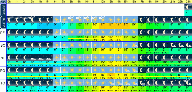 | Ura | 00h | 01h | 02h | 03h | 04h | 05h | 06h | 07h | 08h | 09h | 10h | 11h | 12h | 13h | 14h | 15h | 16h | 17h | 18h | 19h | 20h | 21h | 22h | 23h | |  |  |  |  |  |  |  |  |  |  |  |  |  |  |  |  |  |  |  |  |  |  |  |  | | Temperatura [C°] | 8°C | 7°C | 7°C | 7°C | 6°C | 6°C | 6°C | 7°C | 9°C | 12°C | 14°C | 16°C | 16°C | 17°C | 16°C | 16°C | 14°C | 13°C | 11°C | 10°C | 9°C | 9°C | 8°C | 7°C | | Občutek [C°] | 5°C | 4°C | 4°C | 3°C | 3°C | 3°C | 2°C | 3°C | 6°C | 9°C | 11°C | 13°C | 14°C | 14°C | 14°C | 13°C | 12°C | 10°C | 9°C | 8°C | 7°C | 6°C | 5°C | 4°C | | Možnost padavin | 4 % | 4 % | 4 % | 3 % | 2 % | 2 % | 2 % | 2 % | 2 % | 3 % | 3 % | 3 % | 3 % | 3 % | 3 % | 3 % | 3 % | 3 % | 3 % | 2 % | 2 % | 2 % | 1 % | 1 % | | Količina padavin [mm] | | | | | | | | | | | | | | | | | | | | | | | | | Sneg [cm] | | | | | | | | | | | | | | | | | | | | | | | | | | UV index | | | | | | | | | | | UV 1 | UV 1 | UV 2 | UV 2 | UV 2 | UV 1 | | | | | | | | | | Hitrost vetra | 10 km/h | 11 km/h | 11 km/h | 11 km/h | 12 km/h | 12 km/h | 12 km/h | 12 km/h | 11 km/h | 10 km/h | 10 km/h | 10 km/h | 11 km/h | 11 km/h | 10 km/h | 10 km/h | 10 km/h | 10 km/h | 9 km/h | 9 km/h | 9 km/h | 9 km/h | 10 km/h | 10 km/h | Smer vetra | V | V | V | V | V | V | V | V | V | V | V | V | V | V | V | V | V | V | V | V | V | V | V | V | | Zračni tlak | 1016 | 1016 | 1016 | 1016 | 1016 | 1016 | 1016 | 1016 | 1016 | 1016 | 1016 | 1016 | 1016 | 1015 | 1015 | 1015 | 1015 | 1016 | 1016 | 1017 | 1017 | 1017 | 1017 | 1017 | | Vlaga | 81 % | 85 % | 87 % | 88 % | 89 % | 91 % | 91 % | 87 % | 77 % | 68 % | 62 % | 58 % | 56 % | 56 % | 58 % | 62 % | 68 % | 75 % | 82 % | 84 % | 86 % | 87 % | 88 % | 89 % |