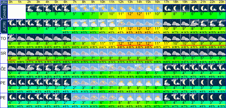 | Ura | 00h | 01h | 02h | 03h | 04h | 05h | 06h | 07h | 08h | 09h | 10h | 11h | 12h | 13h | 14h | 15h | 16h | 17h | 18h | 19h | 20h | 21h | 22h | 23h | |  |  |  |  |  |  |  |  |  |  |  |  |  |  |  |  |  |  |  |  |  |  |  |  | | Temperatura [C°] | 5°C | 5°C | 5°C | 5°C | 4°C | 4°C | 4°C | 5°C | 5°C | 7°C | 9°C | 10°C | 11°C | 12°C | 12°C | 12°C | 11°C | 10°C | 9°C | 9°C | 8°C | 8°C | 8°C | 8°C | | Občutek [C°] | 1°C | 1°C | 1°C | 1°C | 1°C | 1°C | 1°C | 1°C | 2°C | 3°C | 5°C | 7°C | 9°C | 9°C | 10°C | 9°C | 8°C | 7°C | 6°C | 6°C | 5°C | 5°C | 5°C | 5°C | | Možnost padavin | | | | | | | 5 % | 5 % | 5 % | 5 % | 5 % | 5 % | 5 % | 5 % | 5 % | 5 % | 5 % | 6 % | 7 % | 14 % | 14 % | 14 % | 19 % | 15 % | | Količina padavin [mm] | | | | | | | | | | | | | | | | | | | | | | | | | Sneg [cm] | | | | | | | | | | | | | | | | | | | | | | | | | | UV index | | | | | | | | | | | | | UV 1 | | | | | | | | | | | | | Hitrost vetra | 10 km/h | 10 km/h | 10 km/h | 10 km/h | 10 km/h | 10 km/h | 10 km/h | 10 km/h | 10 km/h | 10 km/h | 9 km/h | 8 km/h | 8 km/h | 7 km/h | 7 km/h | 7 km/h | 8 km/h | 8 km/h | 9 km/h | 9 km/h | 9 km/h | 9 km/h | 9 km/h | 9 km/h | Smer vetra | V | V | V | V | V | V | V | V | V | V | V | V | V | V | V | V | V | V | V | V | V | V | V | V | | Zračni tlak | 1016 | 1016 | 1016 | 1016 | 1015 | 1015 | 1015 | 1015 | 1016 | 1016 | 1016 | 1015 | 1015 | 1014 | 1014 | 1014 | 1014 | 1014 | 1014 | 1014 | 1014 | 1014 | 1014 | 1013 | | Vlaga | 82 % | 83 % | 84 % | 84 % | 84 % | 84 % | 85 % | 85 % | 83 % | 78 % | 72 % | 69 % | 67 % | 67 % | 66 % | 68 % | 71 % | 74 % | 76 % | 77 % | 79 % | 80 % | 80 % | 80 % |