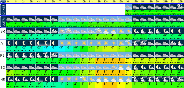 | Ura | 03h | 04h | 05h | 06h | 07h | 08h | 09h | 10h | 11h | 12h | 13h | 14h | 15h | 16h | 17h | 18h | 19h | 20h | 21h | 22h | 23h | | | | |  |  |  |  |  |  |  |  |  |  |  |  |  |  |  |  |  |  |  |  |  | | Temperatura [C°] | 1°C | 1°C | 1°C | 1°C | 1°C | 2°C | 2°C | 3°C | 4°C | 5°C | 5°C | 5°C | 4°C | 4°C | 3°C | 3°C | 2°C | 2°C | 2°C | 2°C | 2°C | | Občutek [C°] | -4°C | -4°C | -4°C | -4°C | -4°C | -4°C | -3°C | -2°C | -1°C | -0°C | -0°C | -0°C | -0°C | -1°C | -2°C | -2°C | -3°C | -3°C | -3°C | -3°C | -3°C | | Možnost padavin | 5 % | 6 % | 6 % | 6 % | 7 % | 7 % | 8 % | 3 % | 9 % | 28 % | 28 % | 47 % | 41 % | 36 % | 48 % | 55 % | 47 % | 35 % | 28 % | 21 % | 16 % | | Količina padavin [mm] | | | | | | | | | | | | | | | | | | | | | | Sneg [cm] | | | | | | | | | | | | | | | | | | | | | | | UV index | | | | | | | | | | | | | | | | | | | | | | | Hitrost vetra | 14 km/h | 14 km/h | 14 km/h | 14 km/h | 14 km/h | 14 km/h | 13 km/h | 13 km/h | 13 km/h | 14 km/h | 13 km/h | 13 km/h | 13 km/h | 13 km/h | 13 km/h | 12 km/h | 12 km/h | 13 km/h | 13 km/h | 13 km/h | 14 km/h | Smer vetra | V | V | V | V | V | V | V | V | V | V | V | V | V | V | V | V | V | V | V | V | V | | Zračni tlak | 1010 | 1010 | 1010 | 1009 | 1009 | 1009 | 1010 | 1010 | 1009 | 1009 | 1009 | 1008 | 1008 | 1008 | 1008 | 1008 | 1008 | 1009 | 1009 | 1009 | 1009 | | Vlaga | 61 % | 62 % | 63 % | 65 % | 66 % | 66 % | 66 % | 64 % | 65 % | 65 % | 69 % | 70 % | 71 % | 72 % | 74 % | 75 % | 76 % | 76 % | 75 % | 74 % | 73 % |