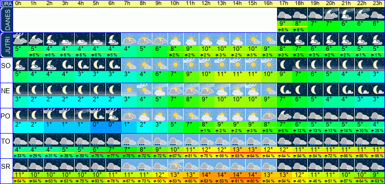 | Ura | 00h | 01h | 02h | 03h | 04h | 05h | 06h | 07h | 08h | 09h | 10h | 11h | 12h | 13h | 14h | 15h | 16h | 17h | 18h | 19h | 20h | 21h | 22h | 23h | |  |  |  |  |  |  |  |  |  |  |  |  |  |  |  |  |  |  |  |  |  |  |  |  | | Temperatura [C°] | 4°C | 4°C | 4°C | 5°C | 5°C | 6°C | 7°C | 7°C | 8°C | 9°C | 10°C | 11°C | 12°C | 12°C | 13°C | 13°C | 12°C | 12°C | 11°C | 11°C | 11°C | 11°C | 11°C | 11°C | | Občutek [C°] | 1°C | 1°C | 1°C | 2°C | 2°C | 3°C | 3°C | 4°C | 4°C | 5°C | 7°C | 8°C | 8°C | 9°C | 10°C | 10°C | 9°C | 9°C | 8°C | 8°C | 8°C | 8°C | 8°C | 8°C | | Možnost padavin | 26 % | 25 % | 25 % | 32 % | 53 % | 69 % | 71 % | 72 % | 67 % | 68 % | 64 % | 78 % | 71 % | 66 % | 61 % | 61 % | 62 % | 63 % | 63 % | 63 % | 70 % | 64 % | 65 % | 66 % | | Količina padavin [mm] | | | | 1 mm | 1 mm | 1 mm | 1 mm | 1 mm | 1 mm | | | | | | | 1 mm | 1 mm | 1 mm | 1 mm | 1 mm | 1 mm | | | | Sneg [cm] | | | | | | | | | | | | | | | | | | | | | | | | | | UV index | | | | | | | | | | | | | | | | | | | | | | | | | | Hitrost vetra | 7 km/h | 7 km/h | 8 km/h | 9 km/h | 9 km/h | 11 km/h | 12 km/h | 13 km/h | 14 km/h | 14 km/h | 15 km/h | 15 km/h | 15 km/h | 15 km/h | 15 km/h | 15 km/h | 14 km/h | 14 km/h | 14 km/h | 14 km/h | 14 km/h | 14 km/h | 14 km/h | 14 km/h | Smer vetra | V | V | V | V | J | J | J | J | J | J | J | J | J | J | J | J | J | J | J | J | J | J | J | J | | Zračni tlak | 1013 | 1013 | 1012 | 1012 | 1012 | 1011 | 1011 | 1011 | 1010 | 1010 | 1010 | 1010 | 1010 | 1010 | 1010 | 1010 | 1010 | 1010 | 1010 | 1010 | 1010 | 1010 | 1010 | 1009 | | Vlaga | 85 % | 87 % | 88 % | 89 % | 91 % | 91 % | 91 % | 91 % | 91 % | 90 % | 89 % | 86 % | 84 % | 83 % | 81 % | 80 % | 81 % | 83 % | 85 % | 86 % | 86 % | 87 % | 87 % | 87 % |