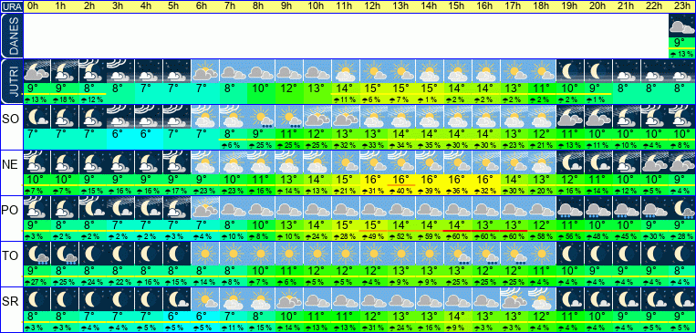| Ura | 00h | 01h | 02h | 03h | 04h | 05h | 06h | 07h | 08h | 09h | 10h | 11h | 12h | 13h | 14h | 15h | 16h | 17h | 18h | 19h | 20h | 21h | 22h | 23h | |  |  |  |  |  |  |  |  |  |  |  |  |  |  |  |  |  |  |  |  |  |  |  |  | | Temperatura [C°] | 10°C | 10°C | 9°C | 9°C | 9°C | 9°C | 9°C | 10°C | 11°C | 13°C | 14°C | 15°C | 16°C | 16°C | 16°C | 16°C | 16°C | 14°C | 13°C | 12°C | 11°C | 10°C | 10°C | 9°C | | Občutek [C°] | 7°C | 6°C | 6°C | 6°C | 6°C | 6°C | 6°C | 7°C | 9°C | 11°C | 12°C | 13°C | 14°C | 14°C | 14°C | 14°C | 14°C | 13°C | 12°C | 10°C | 9°C | 8°C | 8°C | 7°C | | Možnost padavin | 7 % | 7 % | 15 % | 16 % | 16 % | 17 % | 23 % | 23 % | 16 % | 14 % | 13 % | 21 % | 31 % | 40 % | 39 % | 36 % | 32 % | 30 % | 20 % | 16 % | 14 % | 12 % | 5 % | 4 % | | Količina padavin [mm] | | | | | | | | | | | | | | | | | | | | | | | | | Sneg [cm] | | | | | | | | | | | | | | | | | | | | | | | | | | UV index | | | | | | | | | | | UV 1 | UV 1 | UV 2 | UV 2 | UV 2 | UV 1 | UV 1 | | | | | | | | | Hitrost vetra | 13 km/h | 13 km/h | 12 km/h | 12 km/h | 11 km/h | 11 km/h | 10 km/h | 10 km/h | 9 km/h | 9 km/h | 9 km/h | 8 km/h | 8 km/h | 7 km/h | 7 km/h | 6 km/h | 7 km/h | 6 km/h | 5 km/h | 5 km/h | 6 km/h | 6 km/h | 7 km/h | 7 km/h | Smer vetra | V | V | V | V | V | V | V | V | V | V | V | V | Z | Z | Z | S | S | V | V | V | V | V | V | V | | Zračni tlak | 1007 | 1007 | 1007 | 1007 | 1007 | 1007 | 1008 | 1008 | 1009 | 1009 | 1010 | 1010 | 1010 | 1010 | 1010 | 1010 | 1010 | 1011 | 1012 | 1012 | 1013 | 1013 | 1013 | 1013 | | Vlaga | 84 % | 85 % | 86 % | 87 % | 88 % | 89 % | 88 % | 84 % | 79 % | 71 % | 67 % | 64 % | 61 % | 60 % | 60 % | 62 % | 65 % | 71 % | 77 % | 82 % | 84 % | 84 % | 85 % | 85 % |