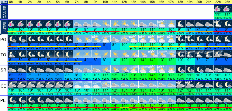 | Ura | 00h | 01h | 02h | 03h | 04h | 05h | 06h | 07h | 08h | 09h | 10h | 11h | 12h | 13h | 14h | 15h | 16h | 17h | 18h | 19h | 20h | 21h | 22h | 23h | |  |  |  |  |  |  |  |  |  |  |  |  |  |  |  |  |  |  |  |  |  |  |  |  | | Temperatura [C°] | 10°C | 10°C | 9°C | 9°C | 9°C | 8°C | 8°C | 8°C | 9°C | 9°C | 10°C | 10°C | 11°C | 11°C | 11°C | 11°C | 11°C | 10°C | 9°C | 8°C | 8°C | 7°C | 6°C | 5°C | | Občutek [C°] | 9°C | 8°C | 8°C | 8°C | 7°C | 7°C | 7°C | 7°C | 7°C | 8°C | 9°C | 9°C | 9°C | 10°C | 10°C | 9°C | 9°C | 8°C | 7°C | 6°C | 5°C | 4°C | 3°C | 2°C | | Možnost padavin | 39 % | 40 % | 27 % | 27 % | 27 % | 26 % | 39 % | 59 % | 72 % | 72 % | 79 % | 67 % | 55 % | 49 % | 49 % | 49 % | 56 % | 68 % | 56 % | 56 % | 50 % | 56 % | 68 % | 61 % | | Količina padavin [mm] | 1 mm | 2 mm | 3 mm | 3 mm | 3 mm | 2 mm | 3 mm | 2 mm | 2 mm | 2 mm | 1 mm | 1 mm | 1 mm | 1 mm | | | | | | 1 mm | 1 mm | | | | Sneg [cm] | | | | | | | | | | | | | | | | | | | | | | | | | | UV index | | | | | | | | | | | | | | | | | | | | | | | | | | Hitrost vetra | 6 km/h | 5 km/h | 5 km/h | 5 km/h | 4 km/h | 4 km/h | 4 km/h | 4 km/h | 4 km/h | 4 km/h | 4 km/h | 5 km/h | 6 km/h | 6 km/h | 6 km/h | 6 km/h | 6 km/h | 6 km/h | 6 km/h | 8 km/h | 9 km/h | 9 km/h | 10 km/h | 10 km/h | Smer vetra | J | J | J | J | J | J | J | V | V | V | S | S | V | S | S | S | S | S | S | S | S | S | V | V | | Zračni tlak | 1006 | 1006 | 1006 | 1005 | 1005 | 1005 | 1005 | 1005 | 1005 | 1005 | 1005 | 1006 | 1005 | 1005 | 1005 | 1005 | 1005 | 1004 | 1005 | 1006 | 1006 | 1007 | 1007 | 1007 | | Vlaga | 94 % | 97 % | 98 % | 100 % | 100 % | 100 % | 100 % | 100 % | 100 % | 98 % | 96 % | 90 % | 84 % | 81 % | 79 % | 79 % | 81 % | 84 % | 86 % | 90 % | 90 % | 91 % | 91 % | 89 % |