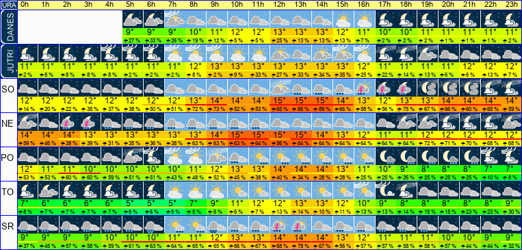 | Temperatura: | 11°C / 13°C / 15°C (+-2°C) | Možnost padavin: | 89 % | Hitrost vetra: | 25 / 30 / 33 km/h (+-15) | Skupna oblačnost: | 59 / 87 / 100 % (+-19) |