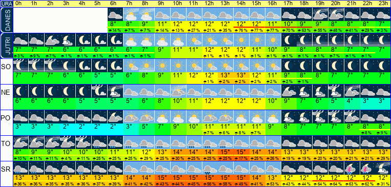 | Temperatura: | 9°C / 11°C / 13°C (+-1°C) | Možnost padavin: | 77 % | Hitrost vetra: | 3 / 10 / 16 km/h (+-8) | Skupna oblačnost: | 32 / 85 / 100 % (+-21) |