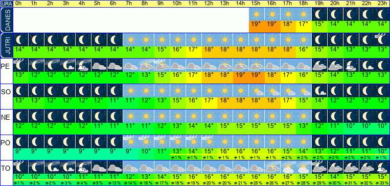 Ura | 00h | 01h | 02h | 03h | 04h | 05h | 06h | 07h | 08h | 09h | 10h | 11h | 12h | 13h | 14h | 15h | 16h | 17h | 18h | 19h | 20h | 21h | 22h | 23h | |  |  |  |  |  |  |  |  |  |  |  |  |  |  |  |  |  |  |  |  |  |  |  |  | Temperatura [C°] | 13°C | 13°C | 12°C | 12°C | 12°C | 12°C | 11°C | 12°C | 13°C | 14°C | 16°C | 17°C | 18°C | 18°C | 18°C | 19°C | 18°C | 17°C | 16°C | 14°C | 13°C | 13°C | 13°C | 13°C | Občutek [C°] | 9°C | 9°C | 9°C | 8°C | 8°C | 8°C | 8°C | 8°C | 9°C | 10°C | 12°C | 13°C | 14°C | 14°C | 15°C | 15°C | 15°C | 14°C | 13°C | 11°C | 10°C | 9°C | 9°C | 9°C | Možnost padavin | | | | | | | | | | | | | | | | | | | | | | | | | Količina padavin [mm] | | | | | | | | | | | | | | | | | | | | | | | | | Sneg [cm] | | | | | | | | | | | | | | | | | | | | | | | | | UV index | | | | | | | | | | | UV 1 | UV 1 | UV 2 | UV 3 | UV 3 | UV 3 | UV 2 | UV 1 | | | | | | | Hitrost vetra | 15 km/h | 15 km/h | 14 km/h | 14 km/h | 14 km/h | 14 km/h | 15 km/h | 15 km/h | 15 km/h | 16 km/h | 17 km/h | 18 km/h | 17 km/h | 16 km/h | 15 km/h | 14 km/h | 13 km/h | 12 km/h | 12 km/h | 12 km/h | 13 km/h | 13 km/h | 14 km/h | 14 km/h | Smer vetra | V | V | V | V | V | V | S | S | S | V | V | V | V | V | V | V | V | S | S | S | V | S | S | S | Zračni tlak | 1019 | 1018 | 1018 | 1018 | 1018 | 1017 | 1017 | 1017 | 1017 | 1018 | 1018 | 1018 | 1018 | 1018 | 1017 | 1017 | 1017 | 1017 | 1017 | 1018 | 1018 | 1019 | 1019 | 1019 | Vlaga | 67 % | 67 % | 67 % | 69 % | 69 % | 70 % | 70 % | 67 % | 62 % | 57 % | 51 % | 47 % | 46 % | 45 % | 46 % | 47 % | 48 % | 52 % | 58 % | 64 % | 67 % | 66 % | 63 % | 63 % |