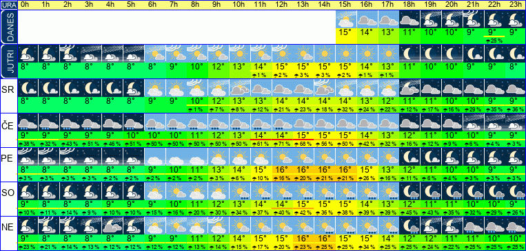 | Ura | 00h | 01h | 02h | 03h | 04h | 05h | 06h | 07h | 08h | 09h | 10h | 11h | 12h | 13h | 14h | 15h | 16h | 17h | 18h | 19h | 20h | 21h | 22h | 23h | |  |  |  |  |  |  |  |  |  |  |  |  |  |  |  |  |  |  |  |  |  |  |  |  | | Temperatura [C°] | 9°C | 9°C | 8°C | 8°C | 9°C | 9°C | 9°C | 10°C | 11°C | 13°C | 14°C | 15°C | 15°C | 16°C | 16°C | 15°C | 14°C | 13°C | 12°C | 11°C | 11°C | 10°C | 10°C | 9°C | | Občutek [C°] | 6°C | 6°C | 6°C | 6°C | 5°C | 6°C | 6°C | 7°C | 8°C | 10°C | 11°C | 12°C | 13°C | 13°C | 13°C | 12°C | 12°C | 11°C | 10°C | 9°C | 8°C | 8°C | 7°C | 7°C | | Možnost padavin | 23 % | 21 % | 14 % | 13 % | 13 % | 12 % | 12 % | 13 % | 13 % | 14 % | 15 % | 17 % | 20 % | 23 % | 25 % | 25 % | 34 % | 25 % | 25 % | 24 % | 22 % | 25 % | 25 % | 25 % | | Količina padavin [mm] | | | | | | | | | | | | | | | | | | | | | | | | | Sneg [cm] | | | | | | | | | | | | | | | | | | | | | | | | | | UV index | | | | | | | | | | | UV 1 | UV 2 | UV 3 | UV 3 | UV 3 | UV 2 | UV 1 | | | | | | | | | Hitrost vetra | 10 km/h | 10 km/h | 10 km/h | 11 km/h | 11 km/h | 11 km/h | 11 km/h | 11 km/h | 11 km/h | 12 km/h | 12 km/h | 12 km/h | 13 km/h | 12 km/h | 12 km/h | 11 km/h | 10 km/h | 10 km/h | 9 km/h | 9 km/h | 8 km/h | 8 km/h | 8 km/h | 9 km/h | Smer vetra | V | V | V | V | V | V | V | V | V | V | S | S | S | S | S | S | S | S | S | S | S | S | S | S | | Zračni tlak | 1014 | 1014 | 1014 | 1014 | 1014 | 1014 | 1014 | 1014 | 1015 | 1015 | 1015 | 1015 | 1015 | 1015 | 1014 | 1014 | 1014 | 1014 | 1014 | 1015 | 1015 | 1015 | 1015 | 1015 | | Vlaga | 92 % | 92 % | 90 % | 89 % | 87 % | 85 % | 83 % | 81 % | 80 % | 74 % | 67 % | 62 % | 58 % | 56 % | 55 % | 56 % | 60 % | 63 % | 67 % | 70 % | 72 % | 74 % | 75 % | 78 % |