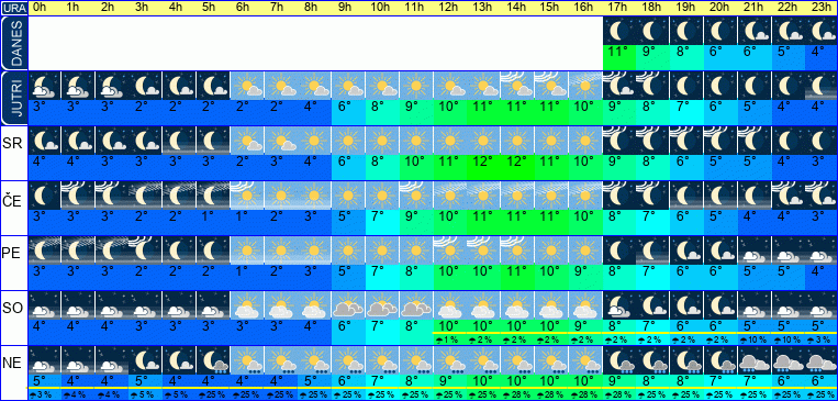 | Ura | 10h | 11h | 12h | 13h | 14h | 15h | 16h | 17h | 18h | 19h | 20h | 21h | 22h | 23h | | | | | | | | | | | |  |  |  |  |  |  |  |  |  |  |  |  |  |  | | Temperatura [C°] | 11°C | 12°C | 13°C | 14°C | 14°C | 13°C | 12°C | 10°C | 8°C | 7°C | 6°C | 5°C | 4°C | 4°C | | Občutek [C°] | 9°C | 9°C | 10°C | 10°C | 11°C | 10°C | 10°C | 8°C | 6°C | 4°C | 3°C | 2°C | 2°C | 1°C | | Možnost padavin | | | | | | | | | | | | | | | | Količina padavin [mm] | | | | | | | | | | | | | | | Sneg [cm] | | | | | | | | | | | | | | | | UV index | UV 1 | UV 1 | UV 2 | UV 2 | UV 2 | UV 1 | | | | | | | | | | Hitrost vetra | 6 km/h | 7 km/h | 8 km/h | 8 km/h | 7 km/h | 6 km/h | 4 km/h | 3 km/h | 3 km/h | 3 km/h | 4 km/h | 4 km/h | 4 km/h | 4 km/h | Smer vetra | Z | Z | Z | Z | Z | Z | J | V | Z | S | S | S | S | Z | | Zračni tlak | 1020 | 1020 | 1020 | 1021 | 1021 | 1022 | 1022 | 1023 | 1024 | 1025 | 1026 | 1026 | 1027 | 1027 | | Vlaga | 55 % | 52 % | 48 % | 46 % | 48 % | 51 % | 57 % | 60 % | 67 % | 71 % | 75 % | 75 % | 77 % | 78 % |