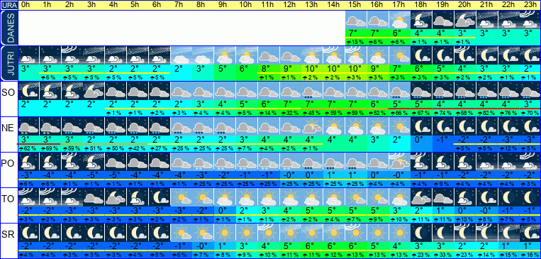 | Ura | 00h | 01h | 02h | 03h | 04h | 05h | 06h | 07h | 08h | 09h | 10h | 11h | 12h | 13h | 14h | 15h | 16h | 17h | 18h | 19h | 20h | 21h | 22h | 23h | |  |  |  |  |  |  |  |  |  |  |  |  |  |  |  |  |  |  |  |  |  |  |  |  | | Temperatura [C°] | -2°C | -2°C | -2°C | -2°C | -2°C | -2°C | -2°C | -1°C | 0°C | 2°C | 3°C | 4°C | 5°C | 6°C | 6°C | 6°C | 5°C | 4°C | 3°C | 3°C | 2°C | 2°C | 1°C | 1°C | | Občutek [C°] | -5°C | -5°C | -6°C | -6°C | -5°C | -5°C | -5°C | -4°C | -3°C | -2°C | -1°C | 0°C | 1°C | 2°C | 2°C | 2°C | 2°C | 1°C | 0°C | -0°C | -1°C | -1°C | -2°C | -2°C | | Možnost padavin | 5 % | 4 % | 3 % | 3 % | 3 % | 4 % | 5 % | 6 % | 7 % | 8 % | 9 % | 10 % | 11 % | 11 % | 12 % | 13 % | 13 % | 13 % | 23 % | 33 % | 23 % | 14 % | 15 % | 16 % | | Količina padavin [mm] | | | | | | | | | | | | | | | | | | | | | | | | | Sneg [cm] | | | | | | | | | | | | | | | | | | | | | | | | | | UV index | | | | | | | | | | | | | | | | | | | | | | | | | | Hitrost vetra | 3 km/h | 3 km/h | 3 km/h | 3 km/h | 3 km/h | 3 km/h | 3 km/h | 3 km/h | 4 km/h | 5 km/h | 6 km/h | 7 km/h | 8 km/h | 7 km/h | 8 km/h | 7 km/h | 6 km/h | 6 km/h | 5 km/h | 5 km/h | 4 km/h | 5 km/h | 4 km/h | 5 km/h | Smer vetra | Z | Z | Z | Z | Z | Z | Z | Z | Z | Z | Z | Z | Z | Z | S | S | S | S | V | V | J | J | J | J | | Zračni tlak | 1013 | 1013 | 1013 | 1014 | 1014 | 1015 | 1015 | 1016 | 1016 | 1016 | 1016 | 1016 | 1016 | 1016 | 1016 | 1016 | 1016 | 1016 | 1017 | 1017 | 1017 | 1018 | 1018 | 1018 | | Vlaga | 74 % | 75 % | 76 % | 77 % | 77 % | 77 % | 77 % | 75 % | 71 % | 66 % | 61 % | 58 % | 56 % | 55 % | 56 % | 58 % | 62 % | 68 % | 74 % | 79 % | 82 % | 85 % | 87 % | 88 % |