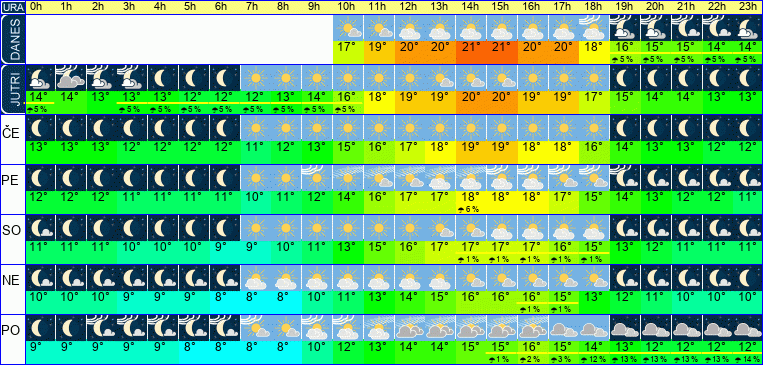 Ura | 07h | 08h | 09h | 10h | 11h | 12h | 13h | 14h | 15h | 16h | 17h | 18h | 19h | 20h | 21h | 22h | 23h | | | | | | | | |  |  |  |  |  |  |  |  |  |  |  |  |  |  |  |  |  | Temperatura [C°] | 14°C | 14°C | 16°C | 17°C | 19°C | 20°C | 20°C | 21°C | 21°C | 20°C | 20°C | 18°C | 16°C | 15°C | 15°C | 14°C | 14°C | Občutek [C°] | 11°C | 12°C | 13°C | 15°C | 17°C | 18°C | 18°C | 19°C | 19°C | 19°C | 18°C | 16°C | 15°C | 14°C | 13°C | 12°C | 12°C | Možnost padavin | | | | | | | | | | | | | 5 % | 5 % | 5 % | 5 % | 5 % | Količina padavin [mm] | | | | | | | | | | | | | | | | | | Sneg [cm] | | | | | | | | | | | | | | | | | | UV index | | | | UV 1 | UV 2 | UV 3 | UV 3 | UV 3 | UV 3 | UV 2 | UV 1 | | | | | | | Hitrost vetra | 8 km/h | 8 km/h | 8 km/h | 7 km/h | 7 km/h | 6 km/h | 6 km/h | 5 km/h | 5 km/h | 5 km/h | 5 km/h | 5 km/h | 6 km/h | 6 km/h | 7 km/h | 7 km/h | 7 km/h | Smer vetra | S | S | S | S | Z | Z | J | J | J | J | J | V | V | S | S | S | S | Zračni tlak | 1022 | 1022 | 1022 | 1022 | 1022 | 1022 | 1021 | 1021 | 1021 | 1020 | 1020 | 1020 | 1021 | 1021 | 1021 | 1021 | 1022 | Vlaga | 54 % | 54 % | 50 % | 47 % | 43 % | 41 % | 42 % | 41 % | 41 % | 39 % | 42 % | 49 % | 59 % | 64 % | 64 % | 63 % | 63 % |