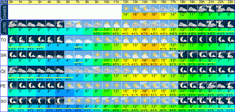 | Ura | 00h | 01h | 02h | 03h | 04h | 05h | 06h | 07h | 08h | 09h | 10h | 11h | 12h | 13h | 14h | 15h | 16h | 17h | 18h | 19h | 20h | 21h | 22h | 23h | |  |  |  |  |  |  |  |  |  |  |  |  |  |  |  |  |  |  |  |  |  |  |  |  | | Temperatura [C°] | 7°C | 6°C | 6°C | 6°C | 5°C | 5°C | 5°C | 5°C | 7°C | 9°C | 11°C | 13°C | 15°C | 15°C | 16°C | 15°C | 15°C | 13°C | 12°C | 11°C | 10°C | 9°C | 8°C | 7°C | | Občutek [C°] | 5°C | 4°C | 4°C | 4°C | 3°C | 3°C | 3°C | 3°C | 5°C | 7°C | 10°C | 12°C | 13°C | 14°C | 14°C | 13°C | 12°C | 11°C | 10°C | 9°C | 8°C | 7°C | 6°C | 5°C | | Možnost padavin | | | | | | | | | | 5 % | 5 % | 5 % | 6 % | 6 % | 7 % | 25 % | 32 % | 32 % | 26 % | 26 % | 26 % | 20 % | 14 % | 19 % | | Količina padavin [mm] | | | | | | | | | | | | | | | | | | | | | | | | | Sneg [cm] | | | | | | | | | | | | | | | | | | | | | | | | | | UV index | | | | | | | | | | | UV 1 | UV 1 | UV 2 | UV 2 | UV 1 | UV 1 | UV 1 | | | | | | | | | Hitrost vetra | 3 km/h | 3 km/h | 3 km/h | 2 km/h | 2 km/h | 2 km/h | 2 km/h | 2 km/h | 2 km/h | 2 km/h | 2 km/h | 2 km/h | 3 km/h | 4 km/h | 4 km/h | 4 km/h | 4 km/h | 4 km/h | 3 km/h | 3 km/h | 2 km/h | 3 km/h | 3 km/h | 3 km/h | Smer vetra | Z | Z | Z | Z | Z | Z | Z | Z | Z | J | Z | J | Z | Z | J | J | J | J | J | S | S | Z | S | Z | | Zračni tlak | 1025 | 1025 | 1025 | 1025 | 1025 | 1025 | 1025 | 1026 | 1026 | 1026 | 1026 | 1025 | 1025 | 1025 | 1024 | 1024 | 1023 | 1024 | 1024 | 1025 | 1025 | 1026 | 1026 | 1026 | | Vlaga | 85 % | 88 % | 89 % | 91 % | 92 % | 94 % | 93 % | 92 % | 90 % | 82 % | 70 % | 61 % | 55 % | 52 % | 50 % | 49 % | 51 % | 56 % | 62 % | 69 % | 74 % | 79 % | 83 % | 87 % |