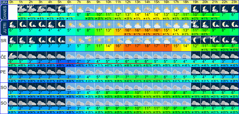 | Ura | | | | | | | | | | | | | | | | | | | | | | | | | | | Temperatura [C°] | | Občutek [C°] | | Možnost padavin | | Količina padavin [mm] | Sneg [cm] | | UV index | | Hitrost vetra | Smer vetra | | Zračni tlak | | Vlaga |