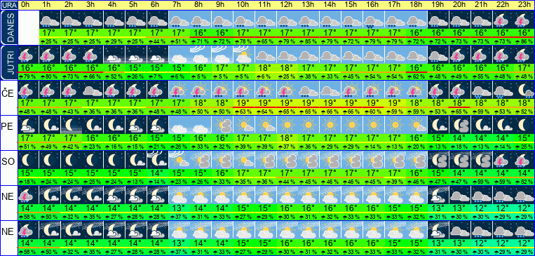 Ura | 00h | 01h | 02h | 03h | 04h | 05h | 06h | 07h | 08h | 09h | 10h | 11h | 12h | 13h | 14h | 15h | 16h | 17h | 18h | 19h | 20h | 21h | 22h | 23h | |  |  |  |  |  |  |  |  |  |  |  |  |  |  |  |  |  |  |  |  |  |  |  |  | Temperatura [C°] | 17°C | 17°C | 17°C | 16°C | 16°C | 16°C | 15°C | 15°C | 16°C | 16°C | 17°C | 17°C | 18°C | 17°C | 17°C | 17°C | 17°C | 17°C | 16°C | 15°C | 14°C | 14°C | 14°C | 15°C | Občutek [C°] | 14°C | 13°C | 12°C | 13°C | 14°C | 15°C | 16°C | 15°C | 15°C | 16°C | 17°C | 17°C | 17°C | 17°C | 16°C | 16°C | 16°C | 16°C | 15°C | 14°C | 14°C | 14°C | 14°C | 14°C | Možnost padavin | 51 % | 49 % | 42 % | 23 % | 16 % | 15 % | 21 % | 26 % | 33 % | 32 % | 39 % | 39 % | 37 % | 36 % | 29 % | 29 % | 14 % | 13 % | 20 % | 13 % | 18 % | 13 % | 14 % | 25 % | Količina padavin [mm] | | | | | | | | | | | | | | | | | | | | | | | | | Sneg [cm] | | | | | | | | | | | | | | | | | | | | | | | | | UV index | | | | | | | | | | | | UV 1 | UV 2 | UV 2 | UV 2 | UV 2 | UV 1 | UV 1 | | | | | | | Hitrost vetra | 28 km/h | 30 km/h | 28 km/h | 22 km/h | 14 km/h | 8 km/h | 4 km/h | 6 km/h | 9 km/h | 8 km/h | 6 km/h | 7 km/h | 8 km/h | 9 km/h | 11 km/h | 11 km/h | 10 km/h | 9 km/h | 8 km/h | 5 km/h | 4 km/h | 3 km/h | 2 km/h | 3 km/h | Smer vetra | Z | Z | Z | Z | Z | Z | Z | Z | J | J | J | J | Z | Z | Z | Z | J | J | J | J | J | J | J | Z | Zračni tlak | 998 | 998 | 999 | 1000 | 1001 | 1002 | 1003 | 1004 | 1005 | 1006 | 1007 | 1008 | 1008 | 1008 | 1008 | 1008 | 1008 | 1007 | 1008 | 1008 | 1008 | 1009 | 1009 | 1009 | Vlaga | 85 % | 83 % | 81 % | 81 % | 81 % | 81 % | 82 % | 83 % | 82 % | 79 % | 76 % | 75 % | 75 % | 75 % | 77 % | 76 % | 77 % | 79 % | 83 % | 87 % | 88 % | 84 % | 80 % | 77 % |