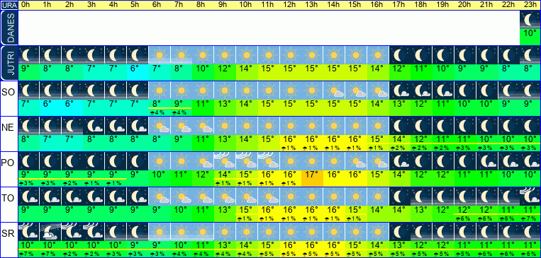 | Ura | 00h | 01h | 02h | 03h | 04h | 05h | 06h | 07h | 08h | 09h | 10h | 11h | 12h | 13h | 14h | 15h | 16h | 17h | 18h | 19h | 20h | 21h | 22h | 23h | |  |  |  |  |  |  |  |  |  |  |  |  |  |  |  |  |  |  |  |  |  |  |  |  | | Temperatura [C°] | 9°C | 9°C | 9°C | 9°C | 9°C | 9°C | 10°C | 11°C | 12°C | 14°C | 15°C | 16°C | 16°C | 17°C | 16°C | 16°C | 15°C | 14°C | 12°C | 12°C | 11°C | 11°C | 10°C | 10°C | | Občutek [C°] | 6°C | 6°C | 6°C | 6°C | 6°C | 6°C | 7°C | 8°C | 10°C | 12°C | 13°C | 14°C | 14°C | 14°C | 14°C | 14°C | 14°C | 12°C | 11°C | 10°C | 9°C | 9°C | 8°C | 7°C | | Možnost padavin | 3 % | 3 % | 2 % | 1 % | 1 % | | | | | 1 % | 1 % | 1 % | 1 % | | | | | | | | | | | | | Količina padavin [mm] | | | | | | | | | | | | | | | | | | | | | | | | | Sneg [cm] | | | | | | | | | | | | | | | | | | | | | | | | | | UV index | | | | | | | | | | | UV 1 | UV 1 | UV 2 | UV 2 | UV 2 | UV 1 | | | | | | | | | | Hitrost vetra | 9 km/h | 9 km/h | 10 km/h | 10 km/h | 9 km/h | 9 km/h | 9 km/h | 8 km/h | 8 km/h | 7 km/h | 8 km/h | 9 km/h | 9 km/h | 10 km/h | 8 km/h | 5 km/h | 4 km/h | 5 km/h | 6 km/h | 6 km/h | 6 km/h | 6 km/h | 6 km/h | 7 km/h | Smer vetra | V | V | S | S | S | V | V | V | V | S | S | S | S | S | S | S | S | S | S | V | V | V | V | V | | Zračni tlak | 1016 | 1016 | 1016 | 1015 | 1015 | 1015 | 1016 | 1016 | 1016 | 1016 | 1016 | 1016 | 1016 | 1015 | 1015 | 1015 | 1015 | 1016 | 1016 | 1017 | 1017 | 1017 | 1017 | 1017 | | Vlaga | 77 % | 76 % | 74 % | 72 % | 72 % | 74 % | 73 % | 70 % | 65 % | 61 % | 58 % | 56 % | 57 % | 57 % | 59 % | 61 % | 66 % | 70 % | 74 % | 76 % | 78 % | 78 % | 78 % | 79 % |