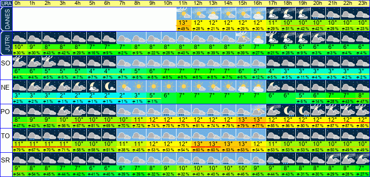 | Ura | 09h | 10h | 11h | 12h | 13h | 14h | 15h | 16h | 17h | 18h | 19h | 20h | 21h | 22h | 23h | | | | | | | | | | |  |  |  |  |  |  |  |  |  |  |  |  |  |  |  | | Temperatura [C°] | 13°C | 13°C | 13°C | 13°C | 13°C | 13°C | 13°C | 12°C | 11°C | 10°C | 10°C | 10°C | 10°C | 10°C | 10°C | | Občutek [C°] | 7°C | 8°C | 8°C | 8°C | 10°C | 10°C | 11°C | 11°C | 10°C | 9°C | 8°C | 9°C | 9°C | 9°C | 8°C | | Možnost padavin | 64 % | 64 % | 56 % | 56 % | 56 % | 56 % | 56 % | 71 % | 49 % | 56 % | 30 % | 37 % | 37 % | 38 % | 57 % | | Količina padavin [mm] | | | | | | | | | | | | 1 mm | | | | Sneg [cm] | | | | | | | | | | | | | | | | | UV index | | | UV 1 | UV 1 | UV 1 | UV 1 | | | | | | | | | | | Hitrost vetra | 30 km/h | 29 km/h | 27 km/h | 24 km/h | 14 km/h | 12 km/h | 9 km/h | 7 km/h | 7 km/h | 6 km/h | 6 km/h | 5 km/h | 6 km/h | 3 km/h | 4 km/h | Smer vetra | Z | Z | Z | Z | Z | Z | S | S | S | S | S | V | S | S | S | | Zračni tlak | 1007 | 1007 | 1007 | 1007 | 1007 | 1007 | 1007 | 1007 | 1007 | 1007 | 1007 | 1007 | 1007 | 1007 | 1006 | | Vlaga | 75 % | 74 % | 72 % | 72 % | 76 % | 77 % | 79 % | 83 % | 87 % | 87 % | 89 % | 90 % | 91 % | 90 % | 90 % |