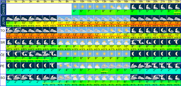 | Ura | 00h | 01h | 02h | 03h | 04h | 05h | 06h | 07h | 08h | 09h | 10h | 11h | 12h | 13h | 14h | 15h | 16h | 17h | 18h | 19h | 20h | 21h | 22h | 23h | |  |  |  |  |  |  |  |  |  |  |  |  |  |  |  |  |  |  |  |  |  |  |  |  | | Temperatura [C°] | 8°C | 9°C | 10°C | 10°C | 11°C | 11°C | 11°C | 11°C | 11°C | 12°C | 12°C | 12°C | 12°C | 12°C | 12°C | 12°C | 12°C | 13°C | 13°C | 13°C | 13°C | 13°C | 13°C | 13°C | | Občutek [C°] | 4°C | 5°C | 6°C | 5°C | 5°C | 5°C | 5°C | 5°C | 5°C | 5°C | 5°C | 5°C | 5°C | 5°C | 5°C | 6°C | 6°C | 6°C | 6°C | 7°C | 7°C | 8°C | 8°C | 8°C | | Možnost padavin | 13 % | 34 % | 28 % | 10 % | 5 % | 44 % | 52 % | 66 % | 79 % | 85 % | 86 % | 86 % | 80 % | 86 % | 92 % | 92 % | 86 % | 92 % | 93 % | 93 % | 93 % | 93 % | 81 % | 81 % | | Količina padavin [mm] | | | | | | | 1 mm | 1 mm | 1 mm | 2 mm | 2 mm | 1 mm | 1 mm | | | 1 mm | 1 mm | 1 mm | 1 mm | | | | | | Sneg [cm] | | | | | | | | | | | | | | | | | | | | | | | | | | UV index | | | | | | | | | | | | | | | | | | | | | | | | | | Hitrost vetra | 13 km/h | 11 km/h | 15 km/h | 20 km/h | 24 km/h | 25 km/h | 24 km/h | 26 km/h | 29 km/h | 32 km/h | 33 km/h | 36 km/h | 37 km/h | 38 km/h | 38 km/h | 36 km/h | 36 km/h | 35 km/h | 35 km/h | 33 km/h | 31 km/h | 31 km/h | 30 km/h | 28 km/h | Smer vetra | V | V | J | J | J | J | J | J | J | J | J | J | J | J | J | J | J | J | J | J | J | J | J | J | | Zračni tlak | 1017 | 1016 | 1015 | 1015 | 1014 | 1013 | 1013 | 1012 | 1012 | 1012 | 1011 | 1010 | 1009 | 1008 | 1008 | 1007 | 1006 | 1005 | 1005 | 1005 | 1004 | 1003 | 1003 | 1002 | | Vlaga | 68 % | 66 % | 64 % | 69 % | 73 % | 77 % | 79 % | 81 % | 83 % | 86 % | 91 % | 95 % | 97 % | 99 % | 100 % | 99 % | 97 % | 95 % | 92 % | 93 % | 92 % | 92 % | 92 % | 92 % |