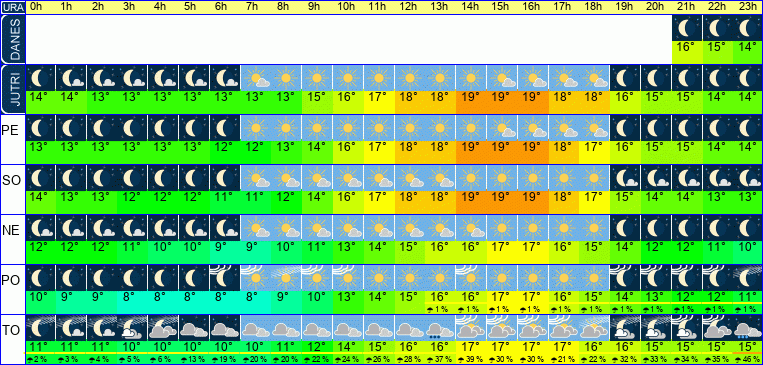 Ura | 00h | 01h | 02h | 03h | 04h | 05h | 06h | 07h | 08h | 09h | 10h | 11h | 12h | 13h | 14h | 15h | 16h | 17h | 18h | 19h | 20h | 21h | 22h | 23h | |  |  |  |  |  |  |  |  |  |  |  |  |  |  |  |  |  |  |  |  |  |  |  |  | Temperatura [C°] | 11°C | 11°C | 11°C | 10°C | 10°C | 10°C | 10°C | 10°C | 11°C | 12°C | 14°C | 15°C | 16°C | 16°C | 17°C | 17°C | 17°C | 17°C | 16°C | 16°C | 15°C | 15°C | 15°C | 15°C | Občutek [C°] | 8°C | 7°C | 7°C | 6°C | 6°C | 6°C | 6°C | 6°C | 7°C | 9°C | 11°C | 13°C | 13°C | 13°C | 14°C | 14°C | 15°C | 14°C | 14°C | 14°C | 14°C | 13°C | 13°C | 13°C | Možnost padavin | 2 % | 3 % | 4 % | 5 % | 6 % | 13 % | 19 % | 20 % | 20 % | 22 % | 24 % | 26 % | 28 % | 37 % | 39 % | 30 % | 30 % | 21 % | 22 % | 32 % | 33 % | 34 % | 35 % | 46 % | Količina padavin [mm] | | | | | | | | | | | | | | 1 mm | | | | | | | | | | 2 mm | Sneg [cm] | | | | | | | | | | | | | | | | | | | | | | | | | UV index | | | | | | | | | | | | UV 1 | UV 1 | UV 2 | UV 2 | UV 2 | UV 1 | UV 1 | | | | | | | Hitrost vetra | 14 km/h | 15 km/h | 15 km/h | 16 km/h | 16 km/h | 16 km/h | 16 km/h | 16 km/h | 15 km/h | 14 km/h | 13 km/h | 14 km/h | 15 km/h | 16 km/h | 16 km/h | 16 km/h | 16 km/h | 15 km/h | 13 km/h | 12 km/h | 12 km/h | 13 km/h | 15 km/h | 16 km/h | Smer vetra | V | V | V | V | V | V | V | V | V | J | J | J | J | J | J | J | J | J | J | J | J | J | J | J | Zračni tlak | 1014 | 1014 | 1014 | 1013 | 1013 | 1013 | 1013 | 1013 | 1013 | 1013 | 1013 | 1013 | 1013 | 1013 | 1012 | 1012 | 1012 | 1012 | 1012 | 1013 | 1013 | 1013 | 1013 | 1013 | Vlaga | 75 % | 73 % | 73 % | 72 % | 73 % | 74 % | 77 % | 80 % | 80 % | 79 % | 78 % | 75 % | 73 % | 71 % | 69 % | 68 % | 68 % | 71 % | 74 % | 79 % | 83 % | 84 % | 83 % | 84 % |