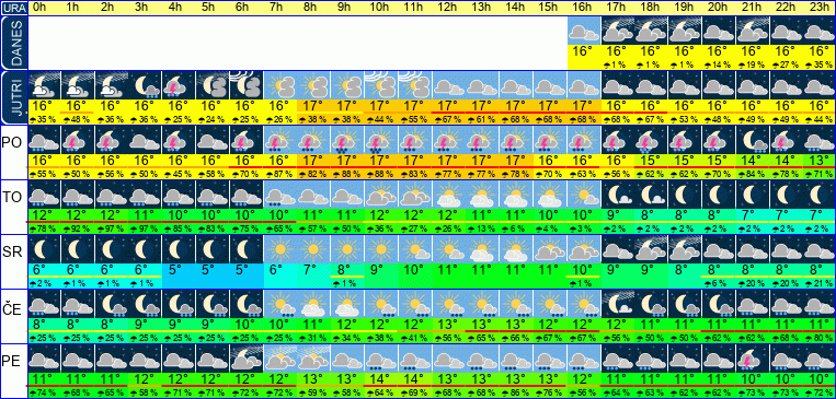 | Temperatura: | 16°C / 16°C / 17°C (+-0°C) | Možnost padavin: | 72 % | Hitrost vetra: | 23 / 26 / 30 km/h (+-3) | Skupna oblačnost: | 62 / 86 / 100 % (+-6) |