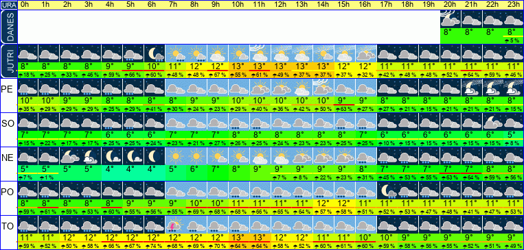 | Temperatura: | 8°C / 11°C / 13°C (+-1°C) | Možnost padavin: | 67 % | Hitrost vetra: | 10 / 15 / 22 km/h (+-6) | Skupna oblačnost: | 35 / 77 / 100 % (+-18) |