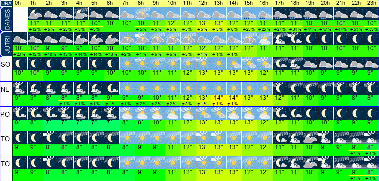 | Temperatura: | 10°C / 11°C / 13°C (+-1°C) | Možnost padavin: | 55 % | Hitrost vetra: | 16 / 20 / 24 km/h (+-2) | Skupna oblačnost: | 79 / 94 / 100 % (+-19) |