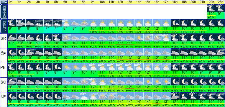 | Ura | 00h | 01h | 02h | 03h | 04h | 05h | 06h | 07h | 08h | 09h | 10h | 11h | 12h | 13h | 14h | 15h | 16h | 17h | 18h | 19h | 20h | 21h | 22h | 23h | |  |  |  |  |  |  |  |  |  |  |  |  |  |  |  |  |  |  |  |  |  |  |  |  | | Temperatura [C°] | 10°C | 9°C | 9°C | 9°C | 8°C | 8°C | 8°C | 9°C | 10°C | 10°C | 11°C | 11°C | 12°C | 12°C | 12°C | 12°C | 12°C | 11°C | 11°C | 10°C | 10°C | 10°C | 10°C | 10°C | | Občutek [C°] | 8°C | 8°C | 7°C | 7°C | 6°C | 6°C | 6°C | 7°C | 8°C | 9°C | 10°C | 10°C | 10°C | 10°C | 11°C | 11°C | 10°C | 10°C | 10°C | 9°C | 9°C | 9°C | 8°C | 8°C | | Možnost padavin | | | | | | | | | | 6 % | 7 % | 9 % | 10 % | 12 % | 7 % | 8 % | 7 % | 7 % | 6 % | 5 % | 3 % | 1 % | | | | Količina padavin [mm] | | | | | | | | | | | | | | | | | | | | | | | | | Sneg [cm] | | | | | | | | | | | | | | | | | | | | | | | | | | UV index | | | | | | | | | | | UV 1 | UV 1 | UV 1 | UV 2 | UV 1 | UV 1 | UV 1 | | | | | | | | | Hitrost vetra | 7 km/h | 7 km/h | 7 km/h | 7 km/h | 7 km/h | 7 km/h | 7 km/h | 7 km/h | 6 km/h | 5 km/h | 5 km/h | 6 km/h | 7 km/h | 8 km/h | 7 km/h | 7 km/h | 7 km/h | 6 km/h | 5 km/h | 5 km/h | 4 km/h | 5 km/h | 5 km/h | 6 km/h | Smer vetra | V | V | V | V | V | V | V | V | V | V | S | S | S | S | S | Z | Z | J | J | J | J | V | V | V | | Zračni tlak | 1025 | 1025 | 1025 | 1025 | 1025 | 1025 | 1025 | 1025 | 1025 | 1025 | 1025 | 1025 | 1024 | 1024 | 1024 | 1023 | 1023 | 1023 | 1023 | 1024 | 1024 | 1024 | 1025 | 1025 | | Vlaga | 89 % | 94 % | 94 % | 96 % | 99 % | 100 % | 95 % | 93 % | 95 % | 94 % | 92 % | 91 % | 90 % | 90 % | 90 % | 90 % | 92 % | 94 % | 94 % | 96 % | 97 % | 96 % | 95 % | 94 % |