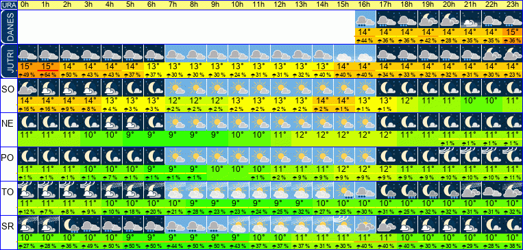 | Ura | 00h | 01h | 02h | 03h | 04h | 05h | 06h | 07h | 08h | 09h | 10h | 11h | 12h | 13h | 14h | 15h | 16h | 17h | 18h | 19h | 20h | 21h | 22h | 23h | |  |  |  |  |  |  |  |  |  |  |  |  |  |  |  |  |  |  |  |  |  |  |  |  | | Temperatura [C°] | 15°C | 15°C | 14°C | 14°C | 14°C | 14°C | 13°C | 13°C | 13°C | 13°C | 13°C | 13°C | 13°C | 14°C | 14°C | 14°C | 14°C | 14°C | 14°C | 14°C | 14°C | 14°C | 14°C | 14°C | | Občutek [C°] | 14°C | 14°C | 13°C | 13°C | 12°C | 12°C | 12°C | 12°C | 12°C | 11°C | 11°C | 12°C | 12°C | 12°C | 13°C | 13°C | 14°C | 14°C | 14°C | 13°C | 13°C | 13°C | 13°C | 13°C | | Možnost padavin | 49 % | 64 % | 50 % | 43 % | 43 % | 37 % | 37 % | 30 % | 30 % | 31 % | 25 % | 32 % | 32 % | 32 % | 40 % | 41 % | 41 % | 34 % | 33 % | 33 % | 33 % | 31 % | 30 % | 23 % | | Količina padavin [mm] | | | | | | | | | | | | | | | | | | | | | | | | | Sneg [cm] | | | | | | | | | | | | | | | | | | | | | | | | | | UV index | | | | | | | | | | | | | | | | | | | | | | | | | | Hitrost vetra | 8 km/h | 8 km/h | 8 km/h | 9 km/h | 9 km/h | 8 km/h | 8 km/h | 8 km/h | 8 km/h | 9 km/h | 9 km/h | 10 km/h | 10 km/h | 9 km/h | 9 km/h | 8 km/h | 7 km/h | 6 km/h | 5 km/h | 5 km/h | 4 km/h | 4 km/h | 4 km/h | 4 km/h | Smer vetra | S | S | V | S | S | V | S | S | V | S | S | Z | S | S | S | V | V | V | V | V | S | V | S | S | | Zračni tlak | 1028 | 1028 | 1028 | 1027 | 1027 | 1027 | 1027 | 1026 | 1026 | 1026 | 1026 | 1026 | 1025 | 1025 | 1025 | 1025 | 1024 | 1024 | 1024 | 1024 | 1024 | 1023 | 1023 | 1023 | | Vlaga | 80 % | 79 % | 80 % | 81 % | 83 % | 84 % | 86 % | 87 % | 88 % | 88 % | 89 % | 89 % | 88 % | 89 % | 89 % | 86 % | 85 % | 83 % | 81 % | 80 % | 81 % | 81 % | 81 % | 80 % |