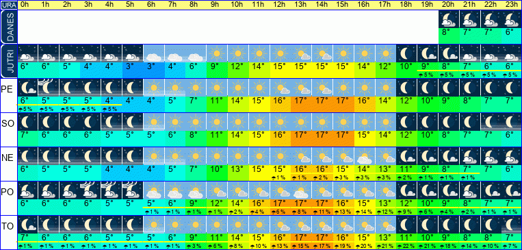| Ura | 00h | 01h | 02h | 03h | 04h | 05h | 06h | 07h | 08h | 09h | 10h | 11h | 12h | 13h | 14h | 15h | 16h | 17h | 18h | 19h | 20h | 21h | 22h | 23h | |  |  |  |  |  |  |  |  |  |  |  |  |  |  |  |  |  |  |  |  |  |  |  |  | | Temperatura [C°] | 5°C | 5°C | 5°C | 5°C | 5°C | 5°C | 5°C | 5°C | 6°C | 6°C | 7°C | 8°C | 8°C | 8°C | 8°C | 8°C | 7°C | 7°C | 6°C | 6°C | 6°C | 6°C | 6°C | 6°C | | Občutek [C°] | 3°C | 3°C | 3°C | 3°C | 3°C | 3°C | 3°C | 3°C | 3°C | 4°C | 5°C | 6°C | 6°C | 6°C | 6°C | 6°C | 5°C | 5°C | 4°C | 4°C | 4°C | 4°C | 4°C | 4°C | | Možnost padavin | 55 % | 55 % | 48 % | 46 % | 45 % | 38 % | 32 % | 32 % | 26 % | 27 % | 26 % | 25 % | 25 % | 31 % | 30 % | 22 % | 22 % | 8 % | 7 % | 13 % | 13 % | 13 % | 21 % | 22 % | | Količina padavin [mm] | | | | | | | | | | | | | | | | | | | | | | | | | Sneg [cm] | | | | | | | | | | | | | | | | | | | | | | | | | | UV index | | | | | | | | | | | | | UV 1 | UV 1 | UV 1 | | | | | | | | | | | Hitrost vetra | 4 km/h | 4 km/h | 5 km/h | 5 km/h | 5 km/h | 5 km/h | 4 km/h | 4 km/h | 4 km/h | 5 km/h | 5 km/h | 5 km/h | 6 km/h | 6 km/h | 6 km/h | 5 km/h | 5 km/h | 4 km/h | 4 km/h | 4 km/h | 4 km/h | 4 km/h | 4 km/h | 4 km/h | Smer vetra | J | J | J | J | J | J | J | J | J | J | J | J | Z | Z | Z | Z | Z | Z | Z | Z | Z | J | J | J | | Zračni tlak | 1023 | 1023 | 1023 | 1023 | 1023 | 1023 | 1023 | 1023 | 1023 | 1023 | 1023 | 1023 | 1023 | 1023 | 1022 | 1022 | 1022 | 1022 | 1022 | 1023 | 1023 | 1023 | 1023 | 1023 | | Vlaga | 90 % | 91 % | 91 % | 91 % | 91 % | 92 % | 93 % | 94 % | 93 % | 89 % | 86 % | 84 % | 82 % | 81 % | 80 % | 82 % | 85 % | 88 % | 90 % | 91 % | 91 % | 91 % | 91 % | 92 % |