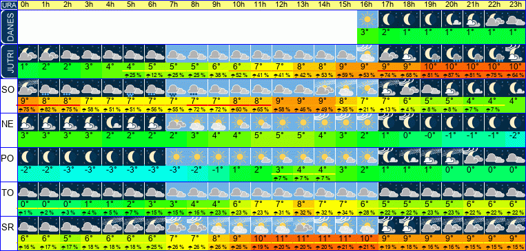 | Ura | 00h | 01h | 02h | 03h | 04h | 05h | 06h | 07h | 08h | 09h | 10h | 11h | 12h | 13h | 14h | 15h | 16h | 17h | 18h | 19h | 20h | 21h | 22h | 23h | |  |  |  |  |  |  |  |  |  |  |  |  |  |  |  |  |  |  |  |  |  |  |  |  | | Temperatura [C°] | -2°C | -2°C | -2°C | -3°C | -3°C | -3°C | -3°C | -3°C | -2°C | -0°C | 1°C | 3°C | 4°C | 5°C | 6°C | 5°C | 4°C | 3°C | 2°C | 2°C | 2°C | 3°C | 3°C | 4°C | | Občutek [C°] | -8°C | -8°C | -8°C | -9°C | -9°C | -9°C | -9°C | -8°C | -7°C | -6°C | -4°C | -2°C | -1°C | 0°C | 1°C | 0°C | -1°C | -2°C | -3°C | -3°C | -3°C | -3°C | -3°C | -2°C | | Možnost padavin | | | | | | | 7 % | 8 % | 1 % | 1 % | 1 % | 2 % | 3 % | 3 % | 4 % | 12 % | 12 % | 20 % | 21 % | 22 % | 23 % | 31 % | 32 % | 26 % | | Količina padavin [mm] | | | | | | | | | | | | | | | | | | | | | | | | | Sneg [cm] | | | | | | | | | | | | | | | | | | | | | | | | | | UV index | | | | | | | | | | | | UV 1 | UV 1 | UV 1 | UV 1 | | | | | | | | | | | Hitrost vetra | 17 km/h | 17 km/h | 15 km/h | 14 km/h | 13 km/h | 13 km/h | 12 km/h | 12 km/h | 12 km/h | 12 km/h | 12 km/h | 12 km/h | 12 km/h | 13 km/h | 12 km/h | 12 km/h | 12 km/h | 13 km/h | 14 km/h | 15 km/h | 16 km/h | 16 km/h | 16 km/h | 16 km/h | Smer vetra | S | S | S | S | S | S | S | S | S | S | S | S | S | S | V | V | V | V | V | V | V | V | V | V | | Zračni tlak | 1022 | 1022 | 1023 | 1023 | 1024 | 1024 | 1024 | 1024 | 1025 | 1025 | 1026 | 1025 | 1025 | 1025 | 1025 | 1025 | 1024 | 1024 | 1024 | 1024 | 1025 | 1025 | 1025 | 1024 | | Vlaga | 54 % | 58 % | 60 % | 62 % | 64 % | 67 % | 68 % | 68 % | 66 % | 62 % | 58 % | 54 % | 51 % | 50 % | 52 % | 55 % | 59 % | 62 % | 64 % | 64 % | 63 % | 61 % | 59 % | 58 % |