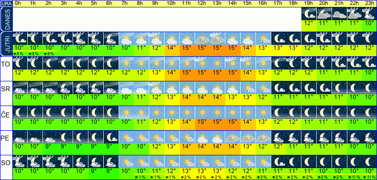 | Ura | 00h | 01h | 02h | 03h | 04h | 05h | 06h | 07h | 08h | 09h | 10h | 11h | 12h | 13h | 14h | 15h | 16h | 17h | 18h | 19h | 20h | 21h | 22h | 23h | |  |  |  |  |  |  |  |  |  |  |  |  |  |  |  |  |  |  |  |  |  |  |  |  | | Temperatura [C°] | 12°C | 12°C | 12°C | 12°C | 12°C | 12°C | 12°C | 12°C | 13°C | 14°C | 15°C | 16°C | 16°C | 16°C | 15°C | 14°C | 14°C | 13°C | 13°C | 12°C | 12°C | 12°C | 11°C | 11°C | | Občutek [C°] | 9°C | 9°C | 9°C | 9°C | 9°C | 9°C | 10°C | 10°C | 11°C | 12°C | 13°C | 14°C | 14°C | 14°C | 14°C | 13°C | 12°C | 12°C | 11°C | 11°C | 10°C | 10°C | 9°C | 9°C | | Možnost padavin | | | | | | | | | | | | | | | | | | | | | | | | | | Količina padavin [mm] | | | | | | | | | | | | | | | | | | | | | | | | | Sneg [cm] | | | | | | | | | | | | | | | | | | | | | | | | | | UV index | | | | | | | | | | | | UV 1 | UV 1 | UV 1 | UV 1 | UV 1 | | | | | | | | | | Hitrost vetra | 10 km/h | 10 km/h | 10 km/h | 9 km/h | 9 km/h | 9 km/h | 8 km/h | 8 km/h | 7 km/h | 7 km/h | 7 km/h | 8 km/h | 9 km/h | 9 km/h | 9 km/h | 8 km/h | 8 km/h | 7 km/h | 7 km/h | 7 km/h | 7 km/h | 8 km/h | 8 km/h | 8 km/h | Smer vetra | S | S | V | V | V | J | V | V | V | V | J | J | J | Z | J | Z | Z | Z | S | S | S | S | S | Z | | Zračni tlak | 1024 | 1025 | 1025 | 1025 | 1024 | 1024 | 1025 | 1025 | 1025 | 1025 | 1025 | 1025 | 1024 | 1023 | 1023 | 1023 | 1023 | 1024 | 1024 | 1024 | 1024 | 1024 | 1024 | 1024 | | Vlaga | 73 % | 69 % | 65 % | 64 % | 68 % | 72 % | 76 % | 78 % | 77 % | 72 % | 67 % | 65 % | 68 % | 70 % | 75 % | 80 % | 82 % | 82 % | 84 % | 85 % | 84 % | 83 % | 81 % | 80 % |