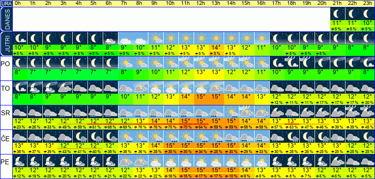 | Ura | 20h | 21h | 22h | 23h | | | | | | | | | | | | | | | | | | | | | |  |  |  |  | | Temperatura [C°] | 11°C | 11°C | 11°C | 10°C | | Občutek [C°] | 8°C | 8°C | 8°C | 7°C | | Možnost padavin | 5 % | 5 % | 5 % | 5 % | | Količina padavin [mm] | | | | | Sneg [cm] | | | | | | UV index | | | | | | Hitrost vetra | 8 km/h | 8 km/h | 8 km/h | 8 km/h | Smer vetra | S | S | S | S | | Zračni tlak | 1026 | 1027 | 1027 | 1027 | | Vlaga | 54 % | 63 % | 66 % | 67 % |