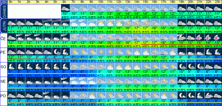 Ura | 03h | 04h | 05h | 06h | 07h | 08h | 09h | 10h | 11h | 12h | 13h | 14h | 15h | 16h | 17h | 18h | 19h | 20h | 21h | 22h | 23h | | | | |  |  |  |  |  |  |  |  |  |  |  |  |  |  |  |  |  |  |  |  |  | Temperatura [C°] | 11°C | 11°C | 11°C | 11°C | 11°C | 11°C | 12°C | 12°C | 13°C | 14°C | 14°C | 14°C | 14°C | 13°C | 13°C | 12°C | 11°C | 11°C | 11°C | 11°C | 11°C | Občutek [C°] | 10°C | 10°C | 10°C | 10°C | 10°C | 11°C | 12°C | 13°C | 14°C | 14°C | 14°C | 14°C | 14°C | 13°C | 13°C | 12°C | 11°C | 11°C | 11°C | 11°C | 11°C | Možnost padavin | 20 % | 20 % | 27 % | 27 % | 27 % | 21 % | 29 % | 44 % | 51 % | 91 % | 91 % | 84 % | 79 % | 79 % | 66 % | 66 % | 65 % | 65 % | 65 % | 64 % | 57 % | Količina padavin [mm] | | | | | | | | | | | | 1 mm | | | 1 mm | | | | | 1 mm | 1 mm | Sneg [cm] | | | | | | | | | | | | | | | | | | | | | | UV index | | | | | | | | | | | | | | | | | | | | | | Hitrost vetra | 3 km/h | 3 km/h | 3 km/h | 4 km/h | 2 km/h | 2 km/h | 2 km/h | 1 km/h | 0 km/h | 1 km/h | 1 km/h | 3 km/h | 2 km/h | 3 km/h | 3 km/h | 1 km/h | 1 km/h | 2 km/h | 2 km/h | 2 km/h | 2 km/h | Smer vetra | Z | J | Z | Z | Z | Z | Z | J | S | V | V | V | S | V | S | S | S | S | S | S | Z | Zračni tlak | 1009 | 1009 | 1008 | 1008 | 1008 | 1008 | 1008 | 1008 | 1009 | 1008 | 1008 | 1008 | 1008 | 1008 | 1008 | 1008 | 1008 | 1008 | 1008 | 1008 | 1008 | Vlaga | 93 % | 90 % | 93 % | 93 % | 92 % | 91 % | 91 % | 92 % | 91 % | 88 % | 86 % | 87 % | 89 % | 92 % | 94 % | 96 % | 98 % | 98 % | 98 % | 98 % | 96 % |