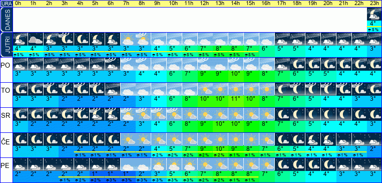 | Ura | 22h | 23h | | | | | | | | | | | | | | | | | | | | | | | |  |  | | Temperatura [C°] | 4°C | 4°C | | Občutek [C°] | 2°C | 2°C | | Možnost padavin | 4 % | 4 % | | Količina padavin [mm] | | | Sneg [cm] | | | | UV index | | | | Hitrost vetra | 3 km/h | 1 km/h | Smer vetra | J | Z | | Zračni tlak | 1016 | 1016 | | Vlaga | 88 % | 89 % |