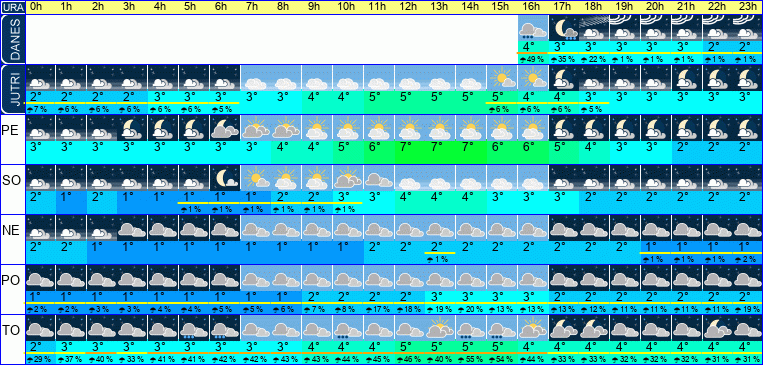 | Ura | 00h | 01h | 02h | 03h | 04h | 05h | 06h | 07h | 08h | 09h | 10h | 11h | 12h | 13h | 14h | 15h | 16h | 17h | 18h | 19h | 20h | 21h | 22h | 23h | |  |  |  |  |  |  |  |  |  |  |  |  |  |  |  |  |  |  |  |  |  |  |  |  | | Temperatura [C°] | 2°C | 2°C | 3°C | 3°C | 3°C | 3°C | 3°C | 3°C | 3°C | 4°C | 4°C | 4°C | 5°C | 5°C | 5°C | 4°C | 4°C | 4°C | 4°C | 4°C | 4°C | 4°C | 4°C | 4°C | | Občutek [C°] | 0°C | 0°C | 1°C | 1°C | 1°C | 1°C | 1°C | 1°C | 1°C | 1°C | 2°C | 2°C | 3°C | 3°C | 3°C | 2°C | 2°C | 2°C | 2°C | 2°C | 2°C | 2°C | 2°C | 2°C | | Možnost padavin | 29 % | 37 % | 40 % | 33 % | 41 % | 41 % | 42 % | 42 % | 43 % | 43 % | 44 % | 45 % | 46 % | 40 % | 55 % | 54 % | 44 % | 33 % | 33 % | 32 % | 32 % | 32 % | 31 % | 31 % | | Količina padavin [mm] | | | | | | 1 mm | 1 mm | | | | 1 mm | | | | 1 mm | 1 mm | | | | | | | | | Sneg [cm] | | | | | | | | | | | | | | | | | | | | | | | | | | UV index | | | | | | | | | | | | | UV 1 | UV 1 | UV 1 | | | | | | | | | | | Hitrost vetra | 1 km/h | 1 km/h | 2 km/h | 2 km/h | 2 km/h | 3 km/h | 3 km/h | 3 km/h | 3 km/h | 3 km/h | 2 km/h | 2 km/h | 2 km/h | 3 km/h | 3 km/h | 3 km/h | 3 km/h | 3 km/h | 3 km/h | 2 km/h | 2 km/h | 3 km/h | 2 km/h | 2 km/h | Smer vetra | S | S | S | S | S | S | S | S | S | S | S | S | V | V | V | V | V | V | V | V | V | S | S | S | | Zračni tlak | 1015 | 1015 | 1014 | 1014 | 1014 | 1014 | 1014 | 1014 | 1014 | 1014 | 1014 | 1013 | 1013 | 1013 | 1013 | 1012 | 1012 | 1013 | 1013 | 1013 | 1013 | 1014 | 1014 | 1014 | | Vlaga | 100 % | 100 % | 100 % | 100 % | 99 % | 98 % | 97 % | 97 % | 97 % | 97 % | 96 % | 94 % | 91 % | 90 % | 91 % | 92 % | 94 % | 95 % | 95 % | 95 % | 95 % | 95 % | 96 % | 96 % |